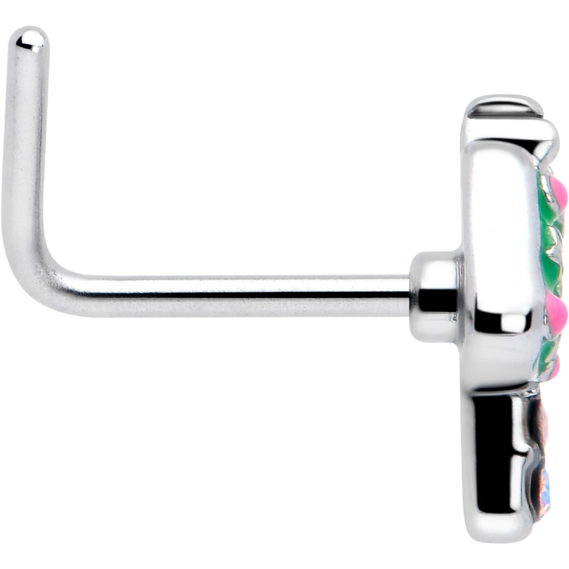 Get trippy in colorful style with this 20 gauge nostril ring. It is made with a 0.27 inch length at the bend 316L surgical grade stainless steel L-shaped post. It features a mushroom charm, with a green cap and pink embellishments as well as aurora gems in the stem. It's further embellished with mystical designs and a tiny snail perched on top. Get psychedelic style and elegant color with this modern mushroom nose piercing jewelry.Specifications