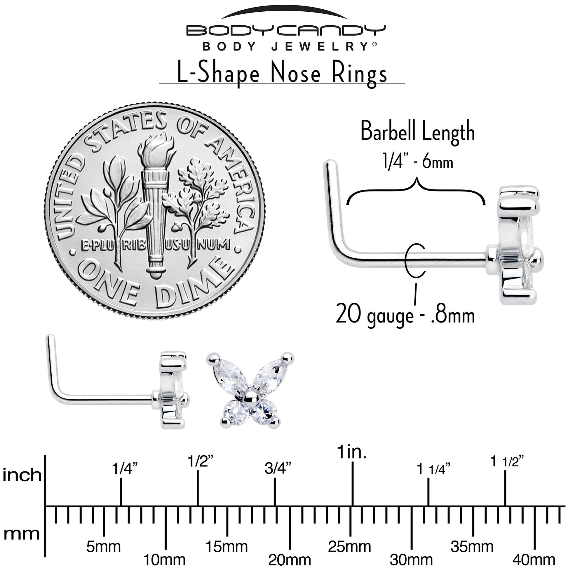 Bedeck your piercing with the beautiful butterfly on this 20 gauge nostril ring. It's made with an 0.27 inch length at the bend 316L surgical grade stainless L-shaped post. It features a dainty butterfly made with four clear cubic zirconia gems. Let this bodacious butterfly pack a powerful punch of polish to your look with this winsome nose piercing jewelry.Specifications