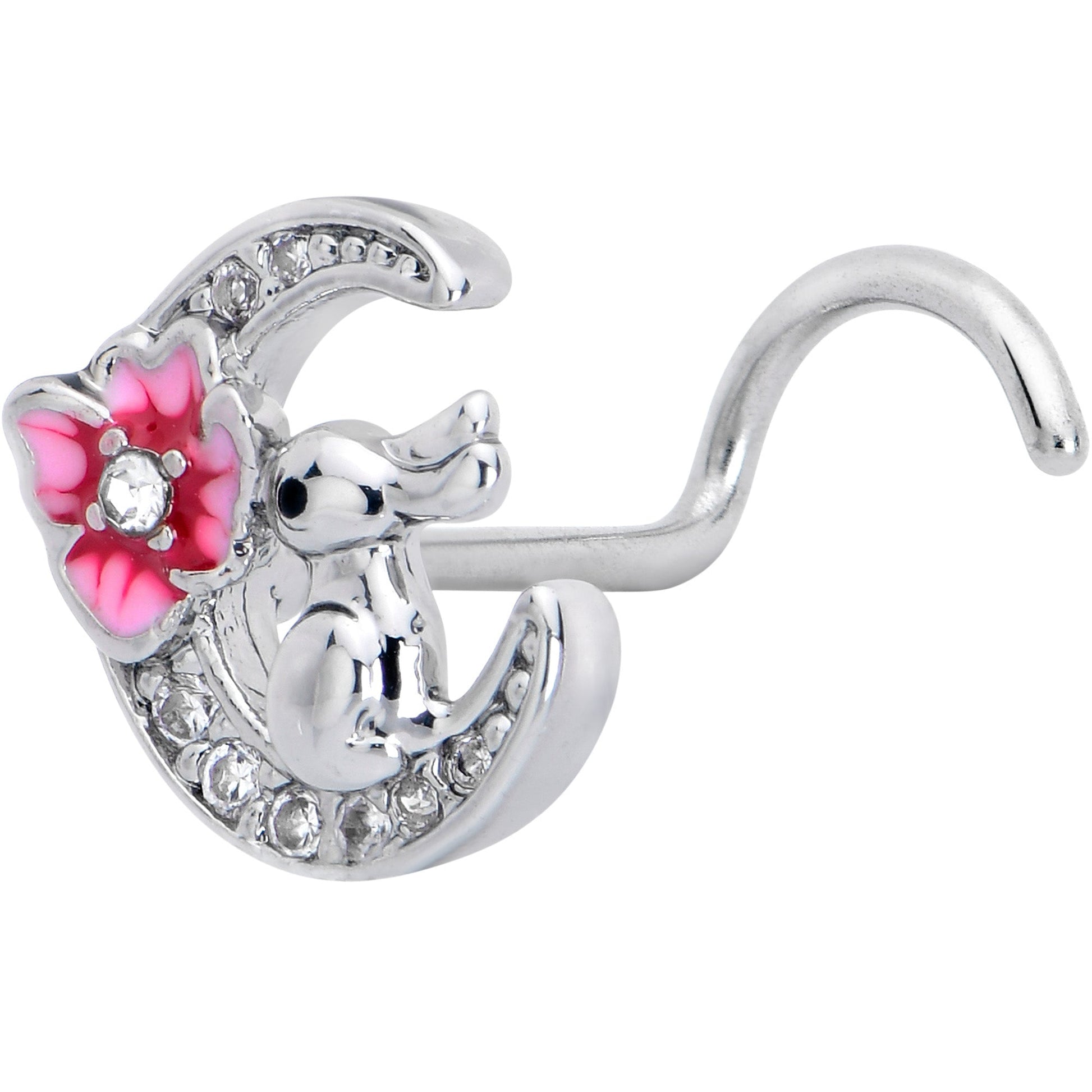 The little bunny on this 20 gauge nostril ring has gone exploring new realms. It's made with a 0.27 inch length at the bend 316L surgical grade stainless steel straight post which is designed for a left side piercing. It features a crescent moon charm, paved with clear cubic zirconia gems. Sitting on the moon is a rabbit, with simple detailing and a black eye embellishment. The moon is further embellished with a pink flower. Fall down a rabbit hole of style with this celestial bunny nose piercing jewelry.Specifications