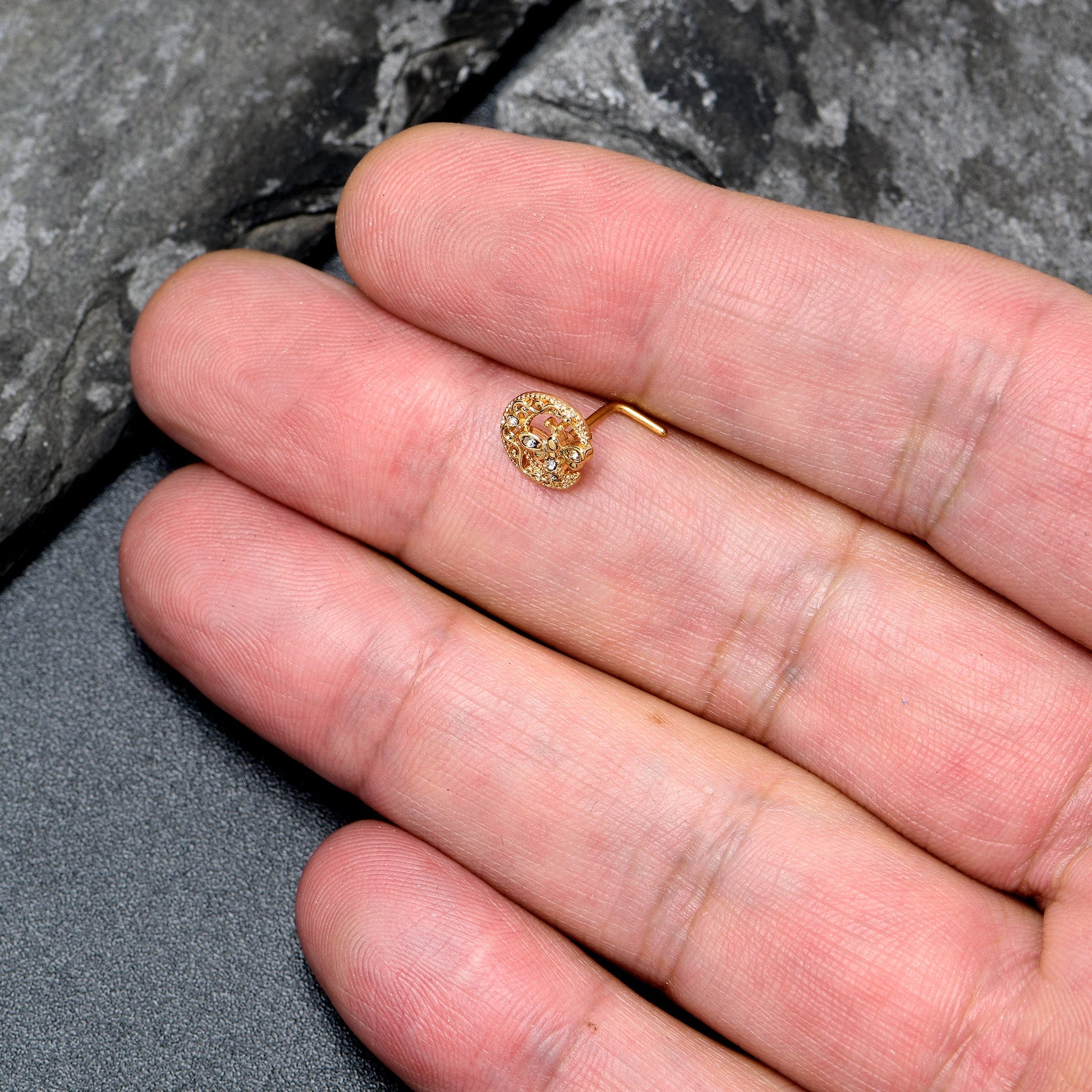 This crescent moon may be alone in the sky but it's got a friend on this 20 gauge nostril ring. It is made with a 0.27 inch length at the bend gold tone plated over 316L surgical grade stainless steel L-shaped post. It features a crescent moon charm, embellished with filigree detailing giving it an airy appearance as well as a clear gem embellishment. Set between the points of the moon is a dragonfly charm, with clear gems in the wings and body. You'll want this nose piercing jewelry to keep you company forever.Specifications
