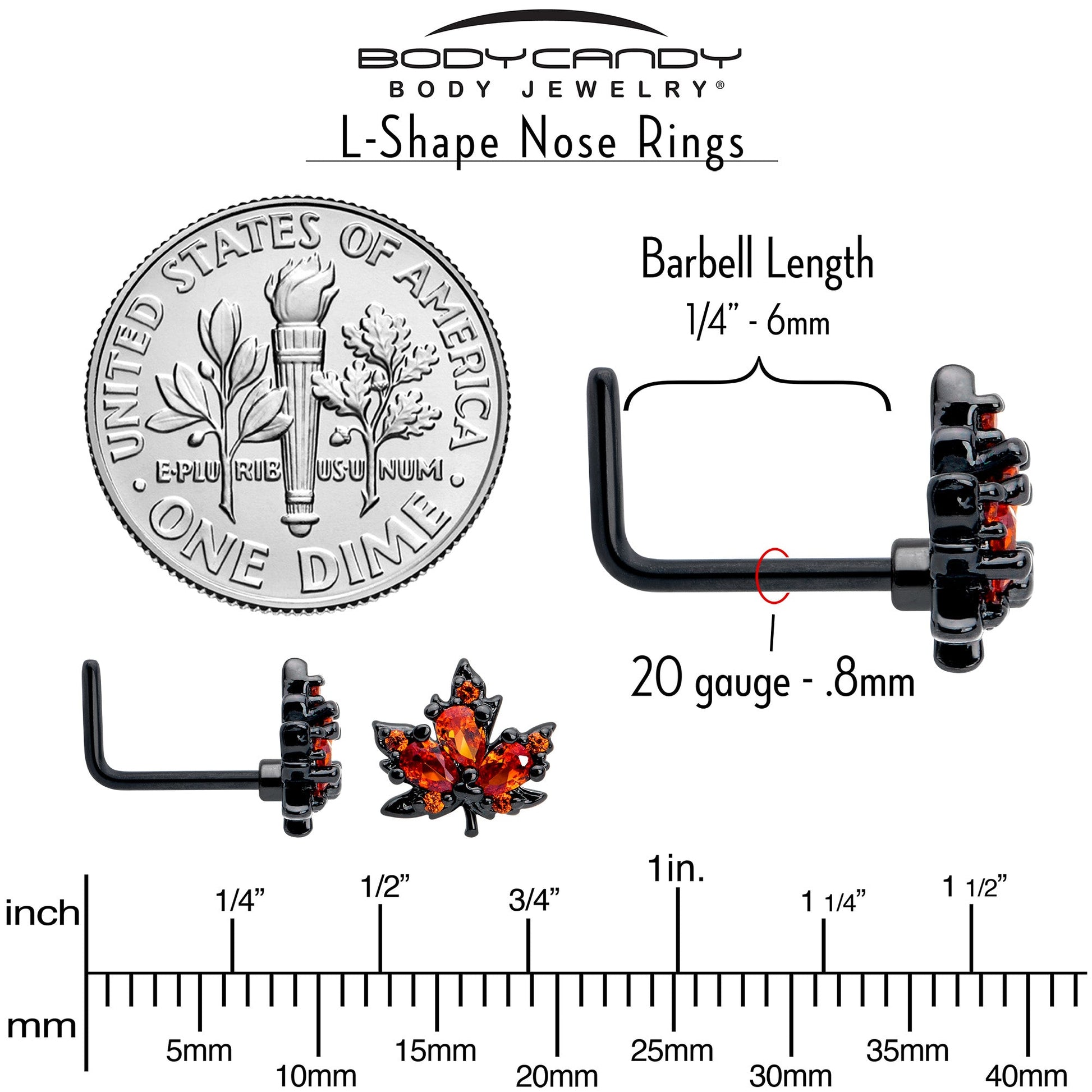 Get ready to fall in love with fall with this 20 gauge nostril ring. It is made with a 0.27 inch length at the bend black PVD over 316L surgical grade stainless steel L-shaped post. It features a maple leaf charm, set with orange cubic zirconia gems. It further features understated detailing for an elegantly simple look. You will be all dolled up for autumn with this classic and colorful nose piercing jewelry.Specifications