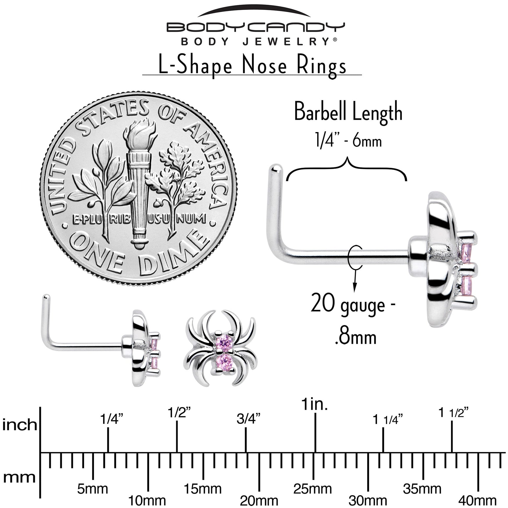 This 20 gauge spider nostril ring will give you the shivers.....but not shivers of fear. It's made with a 0.27 inch length at the bend 316L surgical grade stainless steel L-shaped post. It features a spider charm with the body and the head composed of pink cubic zirconia gems. It also features elegantly delineated legs for extra elegant style. So whether you cherish creepy crawlies or appreciate arachnids, this nose piercing jewelry is sure to snare you in its web.Specifications