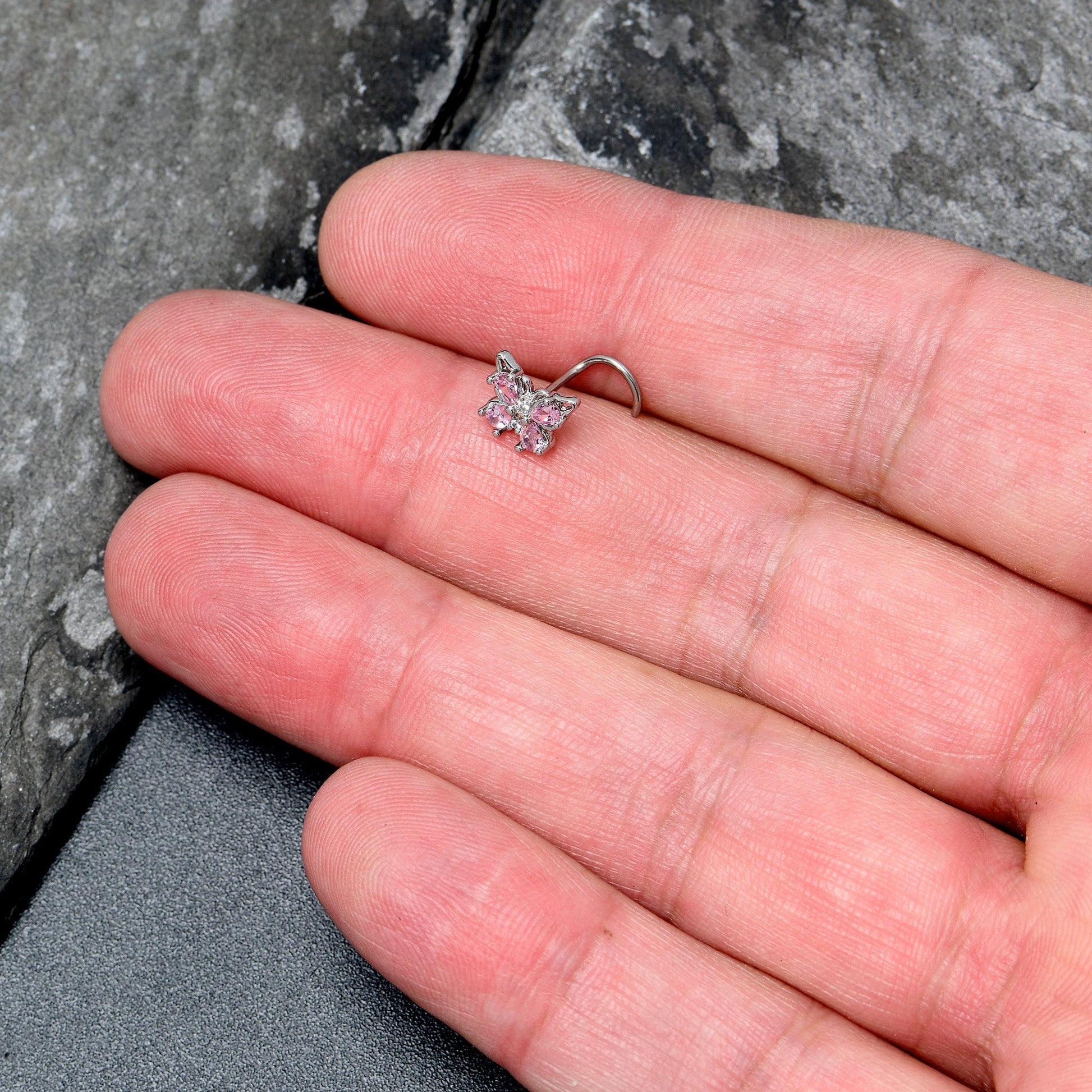 20 Gauge 7mm Pink Gem Baroque Beauty Butterfly Left Side Nose Screw