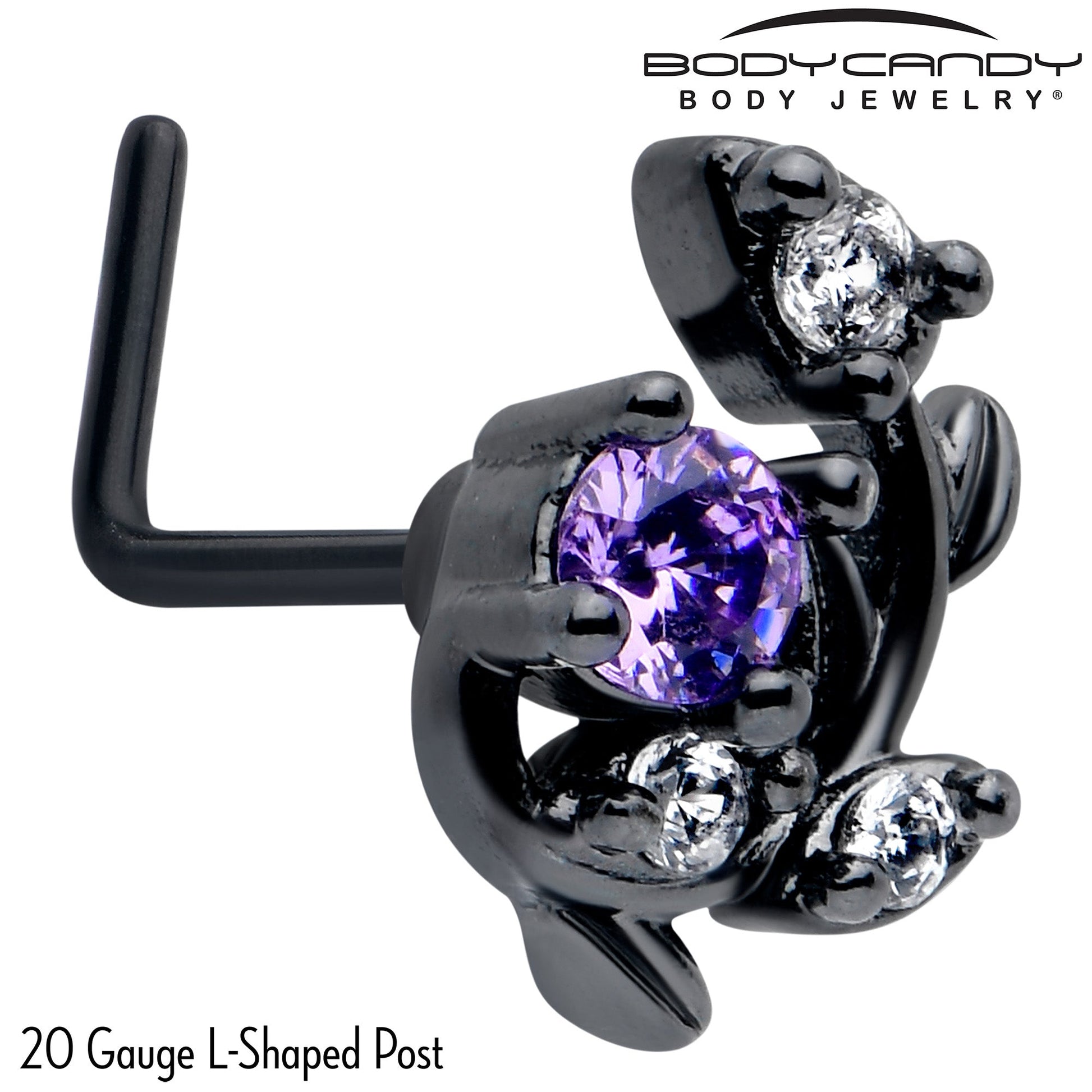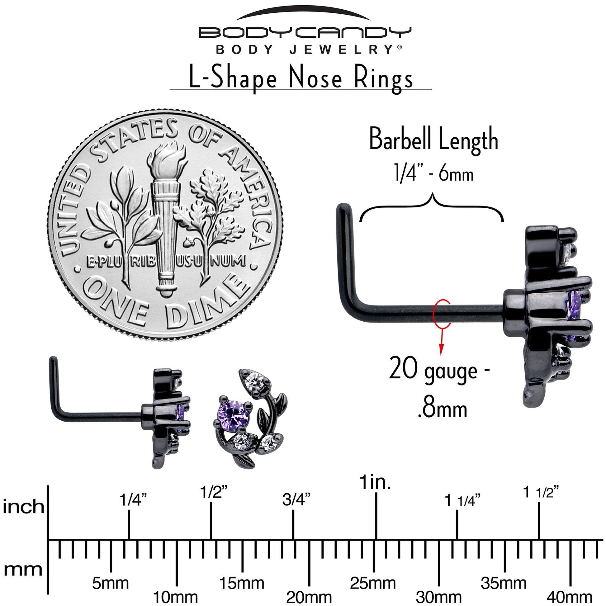 You'll be looking fine when you're rocking the vine on this 20 gauge nostril ring. It's made with an 8mm black PVD over 316L surgical grade stainless steel L-shaped post. It features a leafy vine charm, with the leaves set with purple and clear gems for a gorgeous color contrast. It's further embellished with unadorned leaves for added visual impact. This nose piercing jewelry is sure to grow on you.Specifications