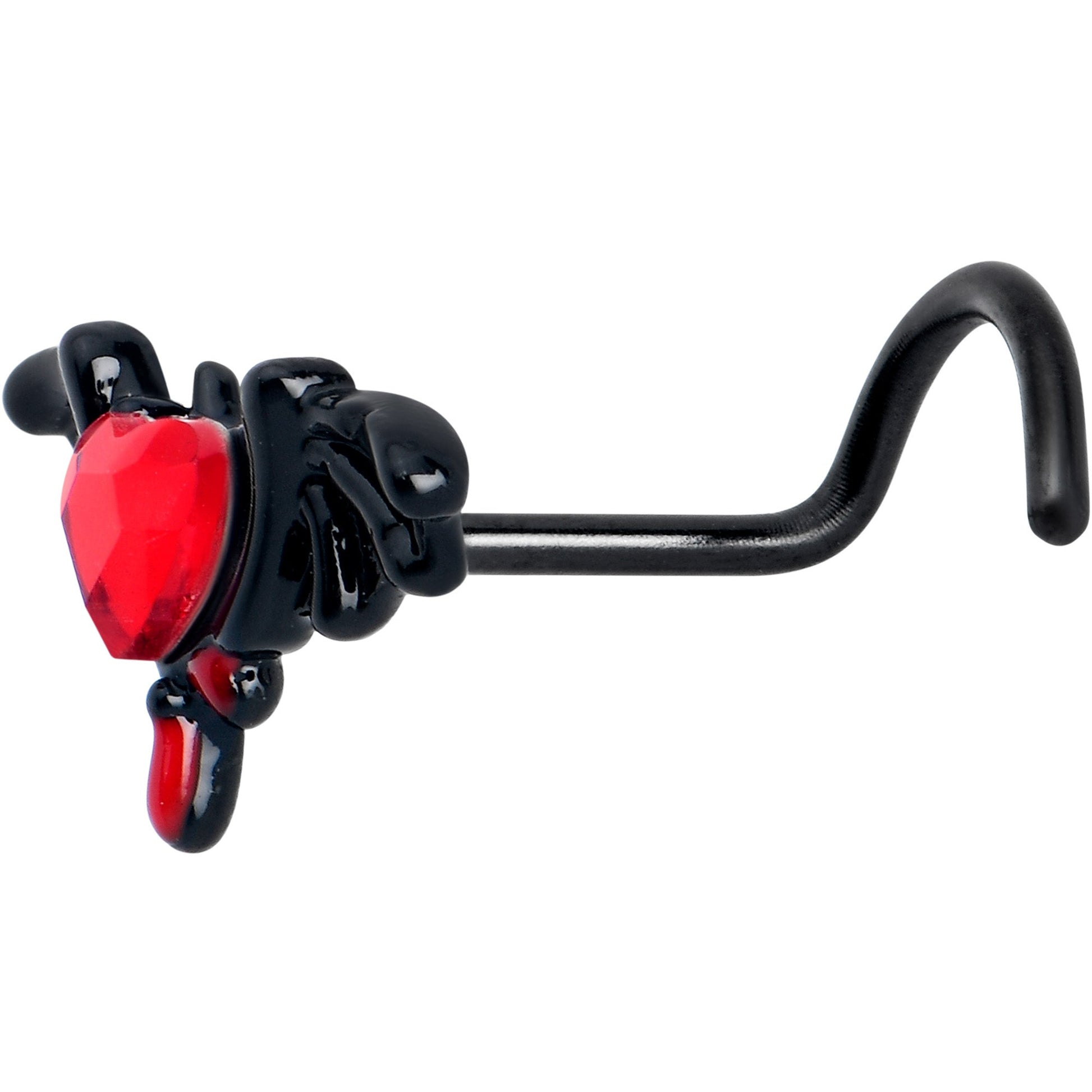 Love the night til it hurts with this 20 gauge nostril ring. It's made with a 0.27 inch length at the bend black plated over 316L surgical grade stainless steel straight post with a left side piercing design. It features a red gem heart embellished with black bat wings. It is further embellished with red drip marks to make the heart look like it's bleeding. You'll love this batty nose piercing jewelry to death.Specifications
