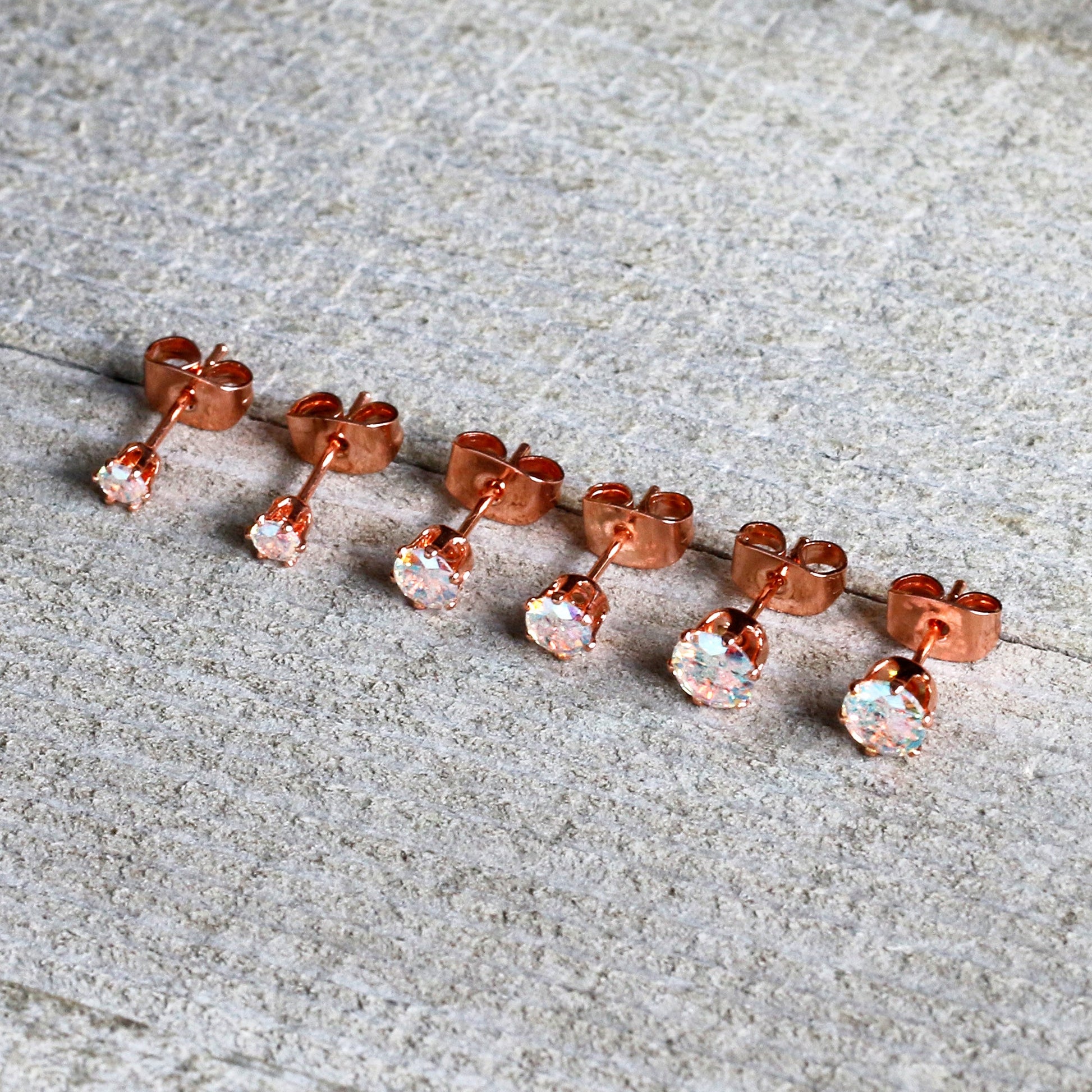 If you're looking for classic style that goes with everything, these 20 gauge earrings will have you ready for any occasion. They're made with rose gold tone plated over stainless steel straight posts and have butterfly-style friction backs for a secure fit. They feature single aurora cubic zirconia gems. You get one pair each in 3mm, 4mm, and 5mm - a touch of classic chic to go with every look. These are sure to add some simple elegance to your pierced lobes. Sold as a set of six.Specifications