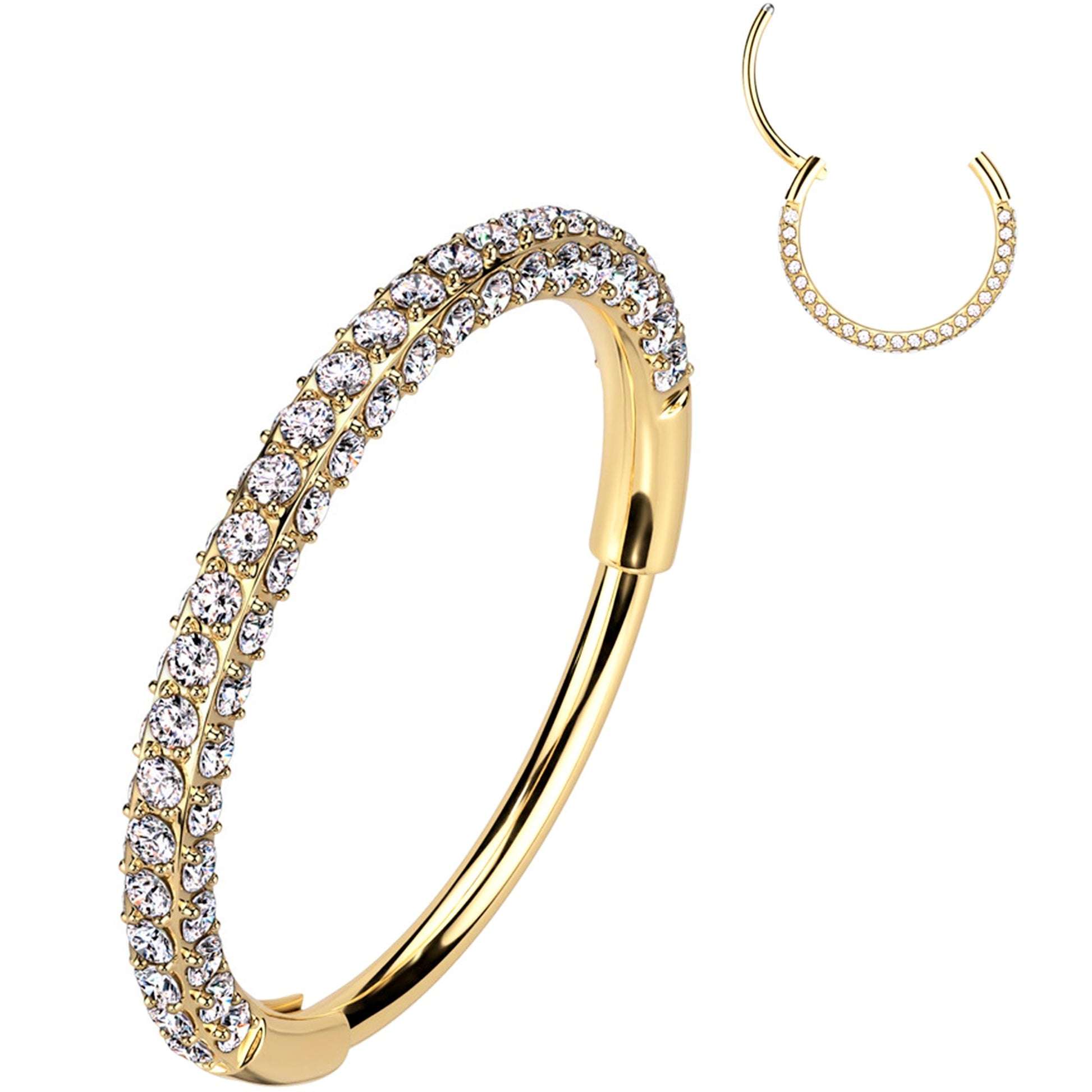 Add a look of sophistication to your nose piercing or ear with this gold PVD 20 gauge implant grade titanium hinged nose ring piercing! The bottom arc of this tragus ring is paved with cubic zirconia gems on both the front and sides of the hoop for a look that's totally attention-getting without being over-the-top.