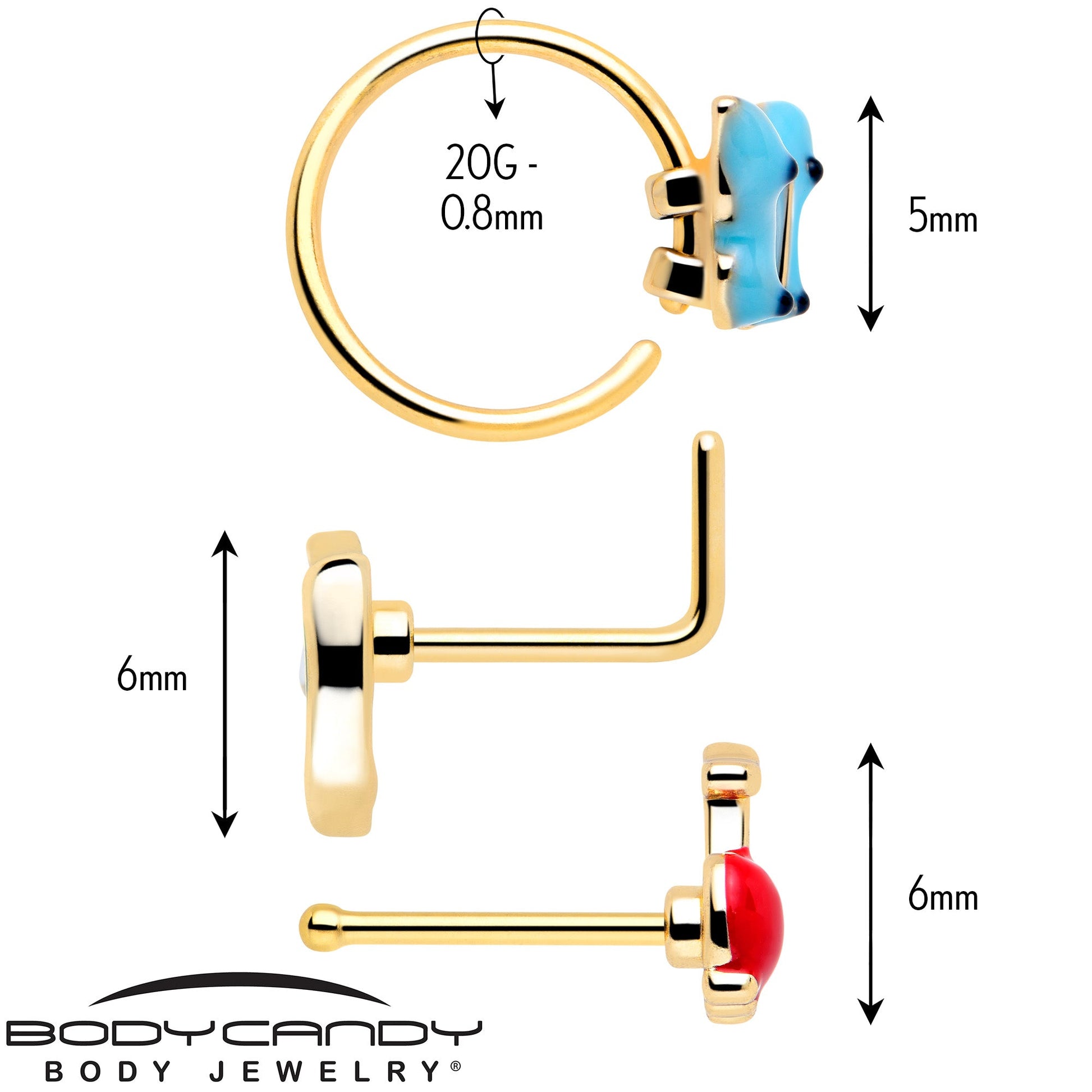 Put a little Spring in your piercings with this set of 20 gauge nostril rings. One is made with 6mm gold tone PVD over 316L surgical grade stainless steel straight post and features a delicious looking red cherries charm. The second one is made with a 7mm length at the bend gold tone PVD over 316L surgical grade stainless steel L-Shaped post and features a white flower charm with green leaf detailing. The third one is made with an 8mm gold tone PVD over 316L surgical grade stainless steel circular ring and features a blue butterfly charm embellished with dark blue polka dot embellishments. Make your nostril piercing feel like Springtime with this cheerful, colorful nose piercing jewelry. Sold as a set of three.Specifications