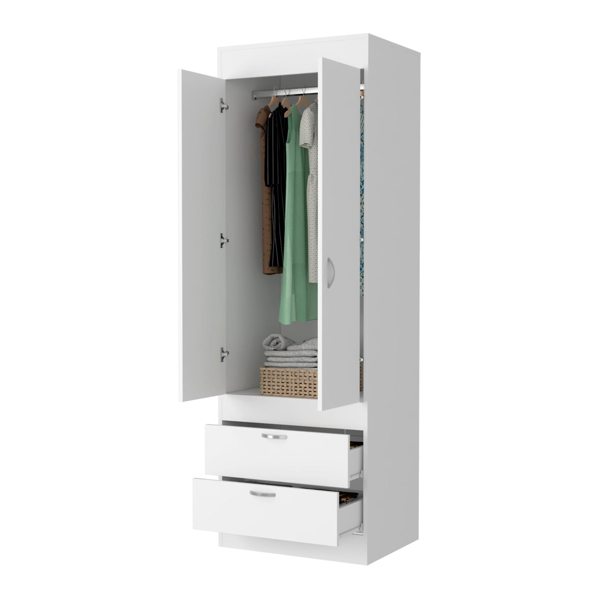 This 23-inch white two drawer dresser is a practical and good looking accent for your bedroom storage and organizational needs. This vertical standard dresser has a convenient and wide top area for your getting ready needs and supplies. Its a high quality piece, made from high grade manufactured wood. The white coloration of this piece is neutral and will blend easily with most any decor. Removable drawers give this chest flexibility and multi-functionality. 70.4-inch H x 23.3-inch W x 18.9-inch D