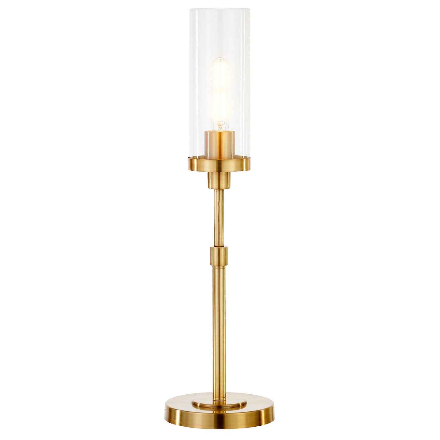 This 26-inch brass metal buffet lamp with clear cylinder shade is a great way to add some brightness to any corner of your home. The base of this lamp is made of brass metal. The clear cylinder glass shade is finishes this piece off nicely and symmetrically this candlestick style buffet table lamp offers a slender profile and will throw just the right amount of light. The light that this lamp throws is soft and warm to elevate the look of most any space in your home. Bring some lite and good vibes into your space with this updated and stylishly designed lamp. 26-inch H x 7-inch W x 7-inch D