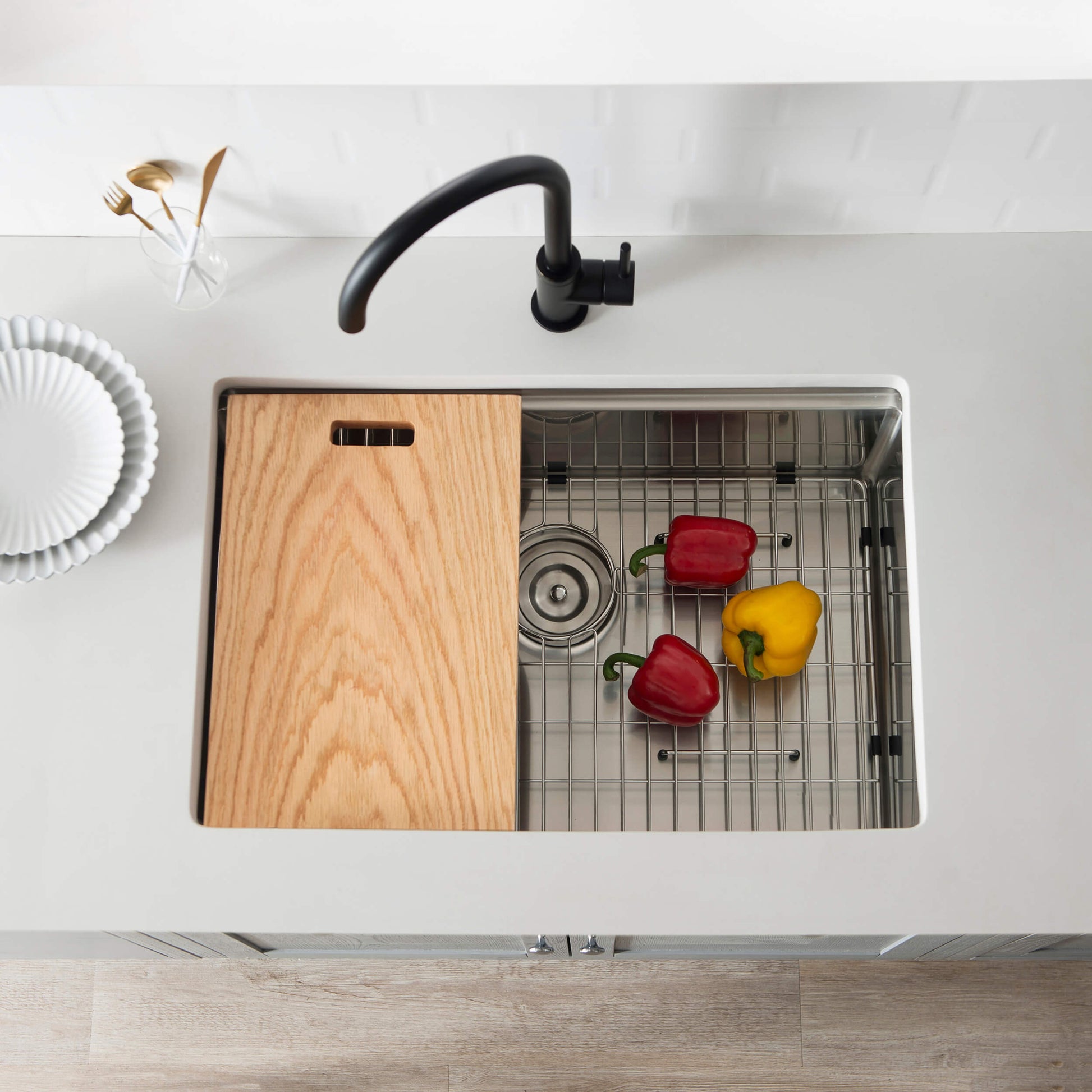 INCLUDED: Stainless Steel Kitchen Sink, Basin Rack/Bottom Grid, Basket Strainer, Cutting Board, Colander, Drain Assembly/ Waste. NOT INCLUDED: Trap/Water trap.
