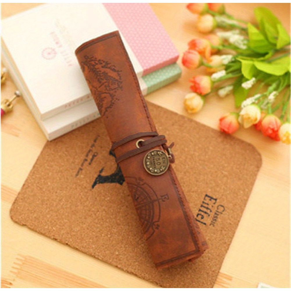 2pcs Vintage Treasure Map Pencil Pouch: 1pc PU Leather Roll-up Pen Bag for Cosmetic & Stationery Storage in Office & School Supplies