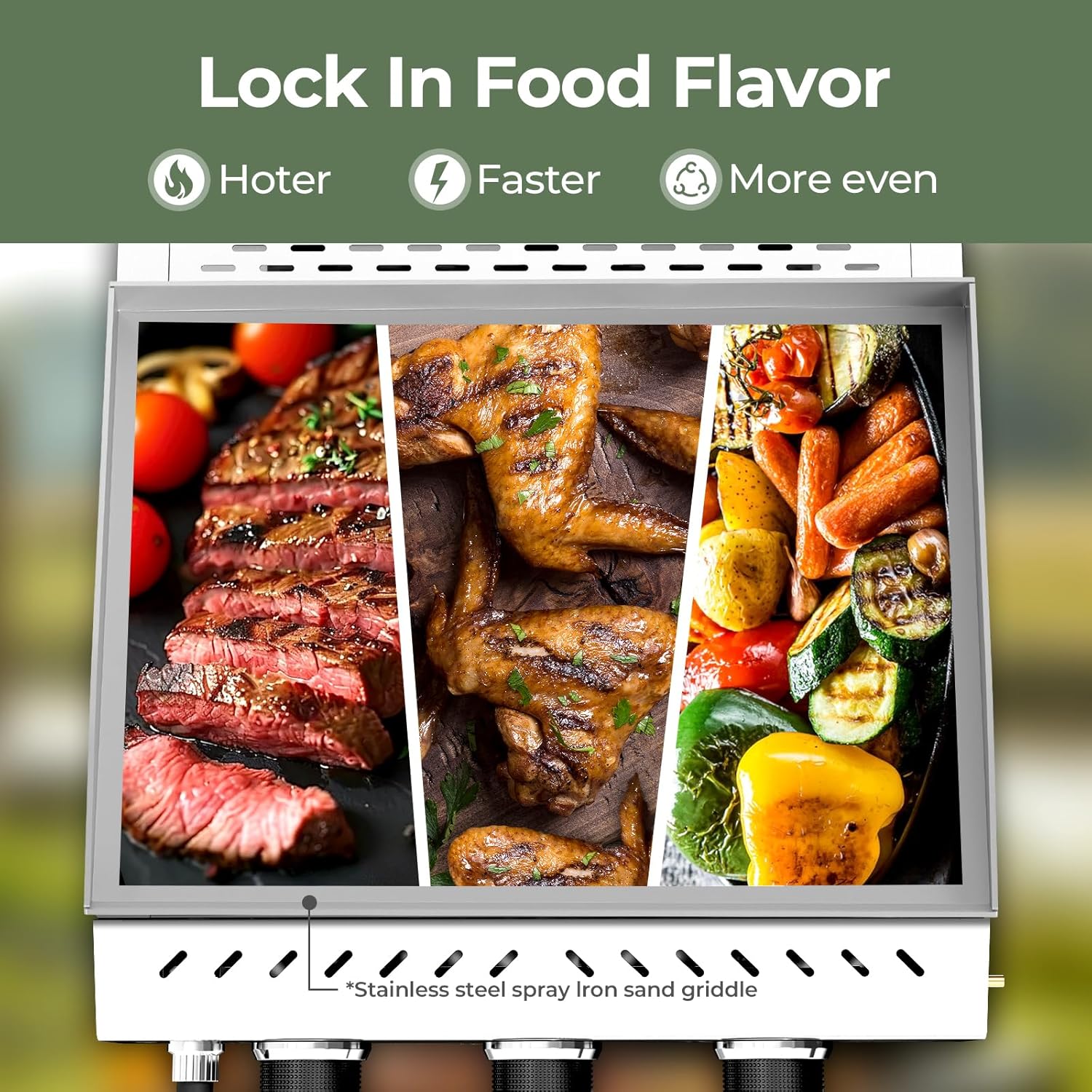 - Durable and uniform heating: The propane griddle is made of stainless steel, rust and corrosion resistant, long time to accompany.With 3 independently controlled tube burners with 8,000 BTU, controlled from low to high for a total of 24,000 BTU, can be used for a variety of cooking options. Gas grill can be adjusted to create different hot zones by adjusting the burner.