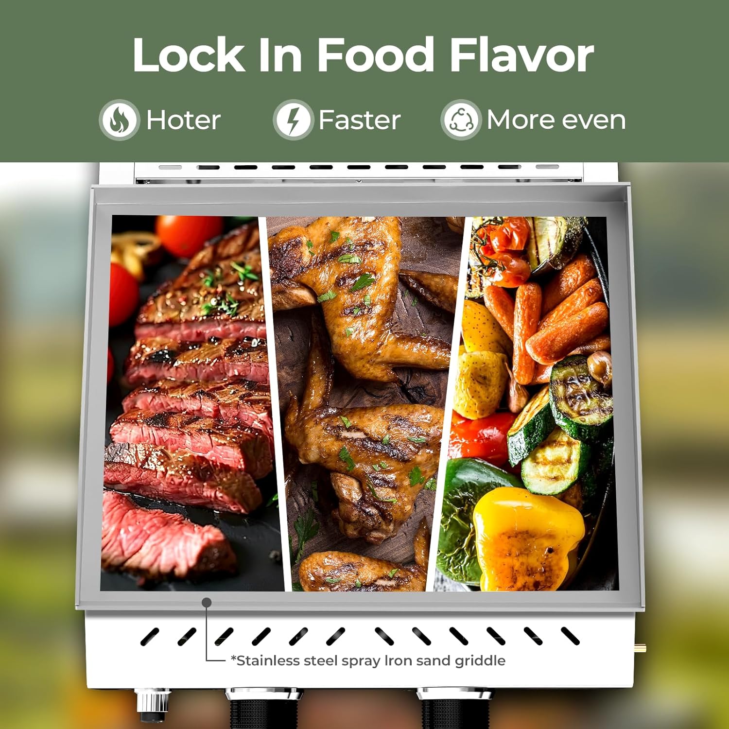 - Durable and Uniform Heating: The propane griddle is made of stainless steel, rust and corrosion resistant, long time to accompany.With independently controlled tube burners with 8,000 BTU, can be used for a variety of cooking options.