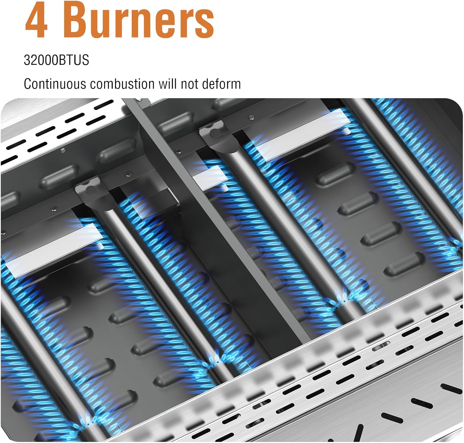 - 【4 Robust Turbo-Fueled Burners】:4 independently controlled 8000BTU burners, which continuously produce blue flames, can freely adjust the temperature from low to high for a total of 16,000 BTU according to your needs, suitable for various cooking methods