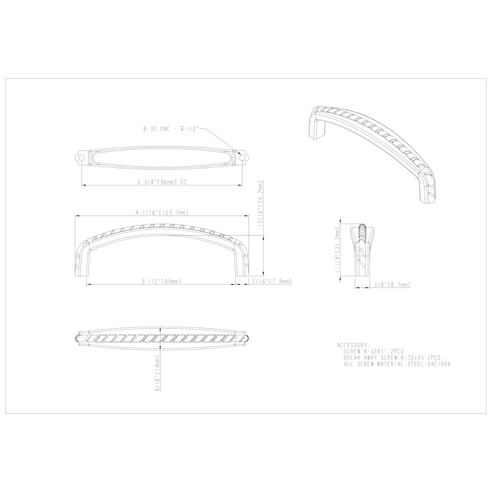 The Artesian style rope accent of this Satin Nickel 3-7/16" overall length pull in the Cypress collection by Elements adds sophisticated appeal to your home with craftsmanlike detail. With a coordinating rope detailed knob and additional pull length, this collection is the perfect accent to any cabinet and is available in three other finishes. Each item is individually wrapped to protect the item from damage. Attachment hardware is included.