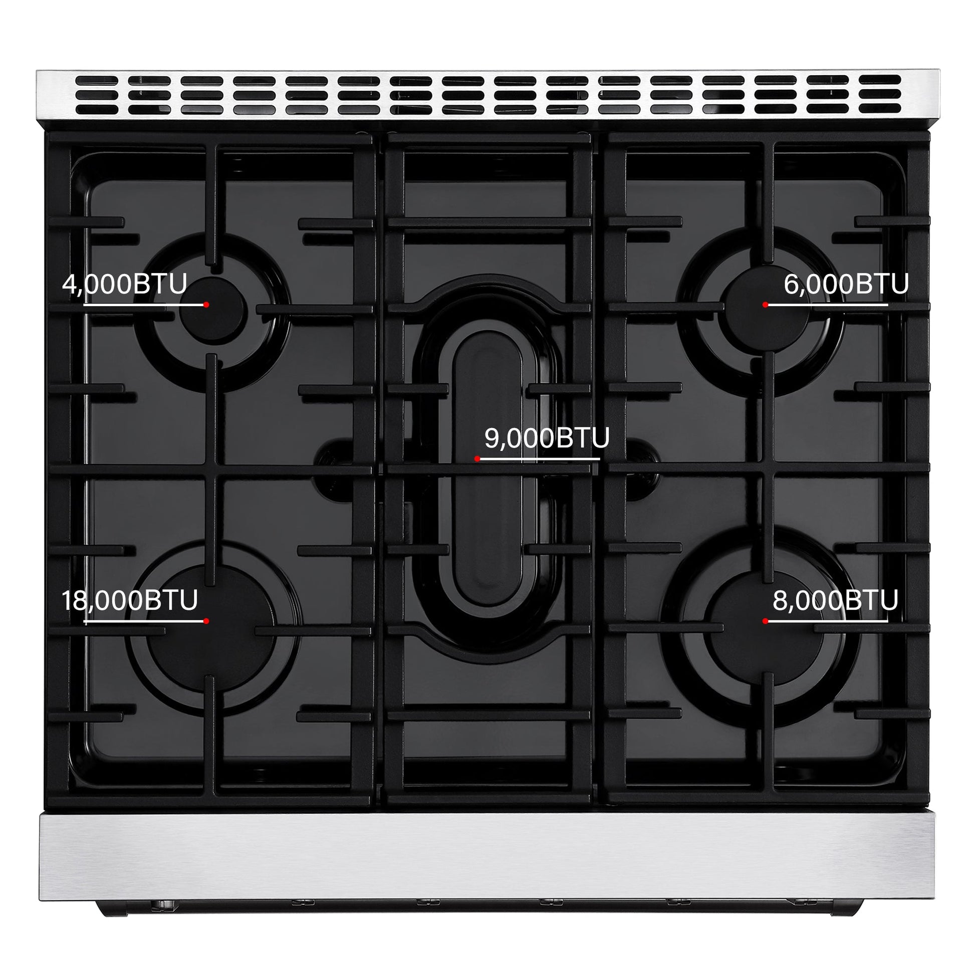 The slide-in gas range offers heavy-duty cast iron grates and 5 versatile burners, a high-intensity 18000-BTU burner, an 8000-BTU burner, and a 6000-BTU burner, a 4000-BTU burner, and an oval 9000-BTU burner that distributes even heat for simmer, boil, stir-frying, steaming, melting, or even caramelizing!
