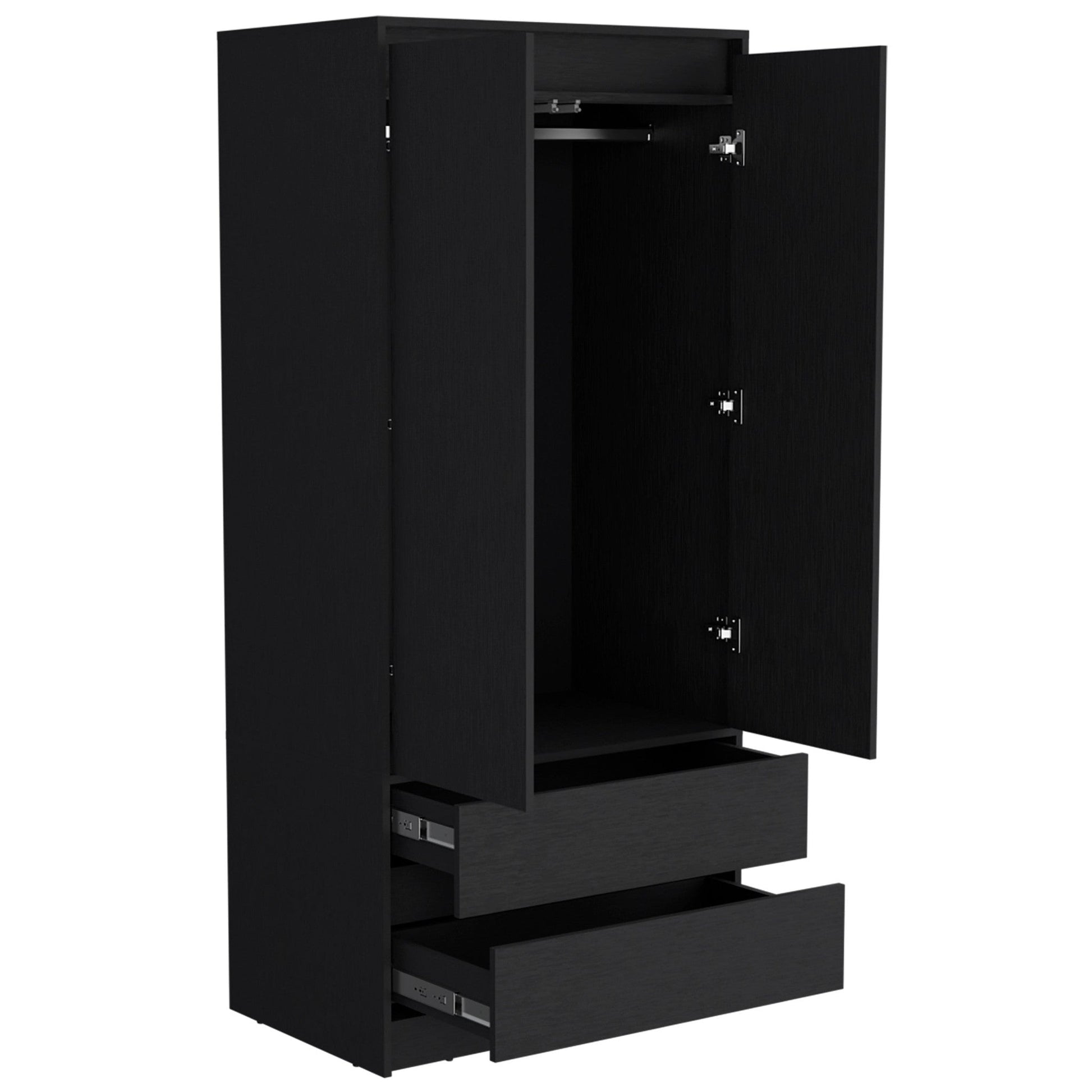 This 32" black two drawer combo dresser is a practical and good looking accent for your bedroom storage and organizational needs. This combo dresser gives you the added bonus of both drawer storage and cabinet storage to accommodate various sizes and types of items. Its a high quality piece, made from high grade manufactured wood. The black coloration of this piece gives it an updated, and modern edge. Removable drawers give this chest flexibility and multi-functionality. 70.87" H x 31.50" W x 20.47" D