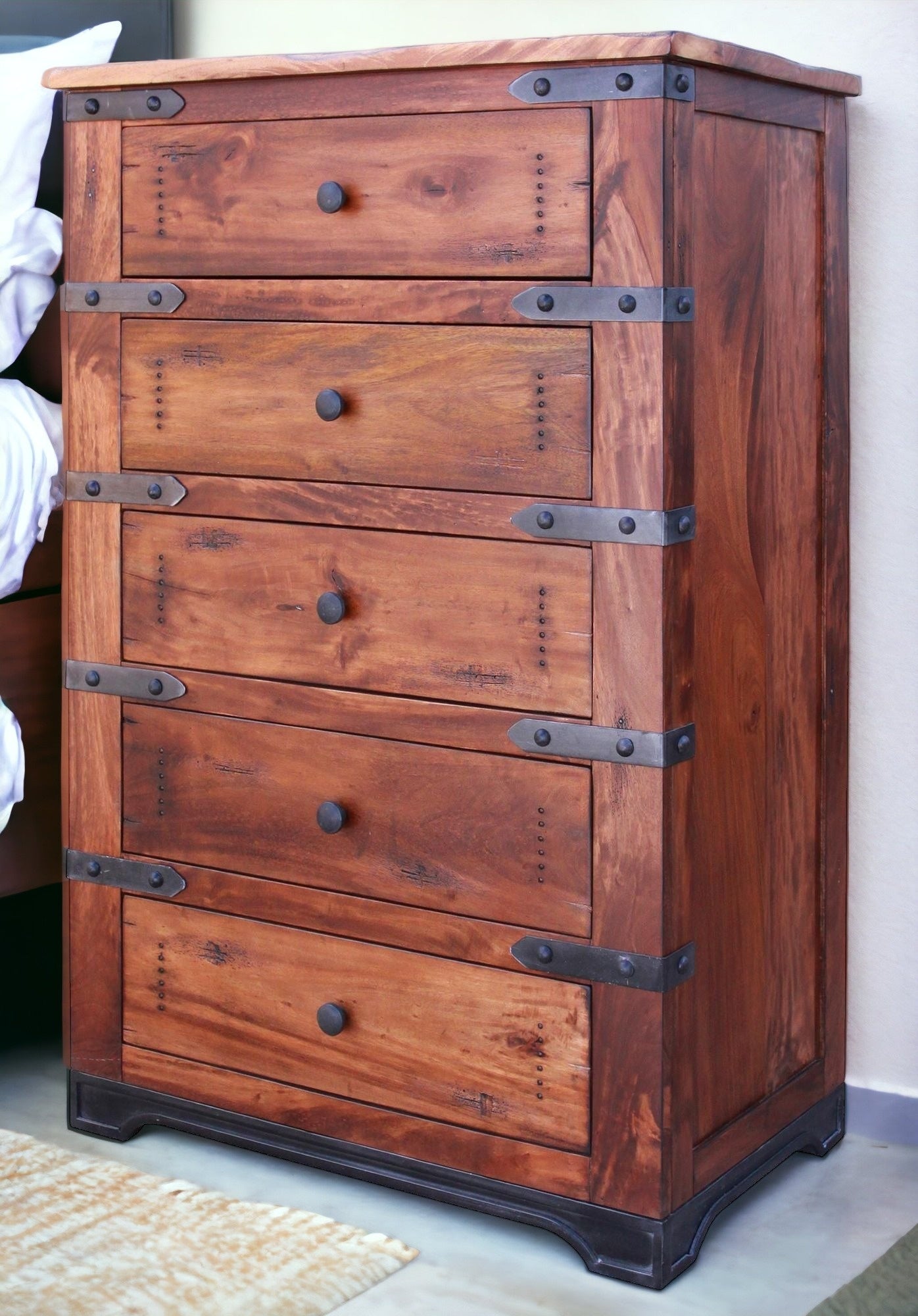 Add personality to your bedroom style and a feeling of coziness with this 36" natural solid wood five drawer standard chest. The space saving design of this standard chest makes it a great choice for space challenged spaces or small walls within your room. Equipped with five easy open drawers for practical and good looking clothing storage. This dresser is built to last from high quality solid wood, The natural coloration of this piece is neutral and will blend easily with most any decor. 54.5" H x 36.25" W x 20" D