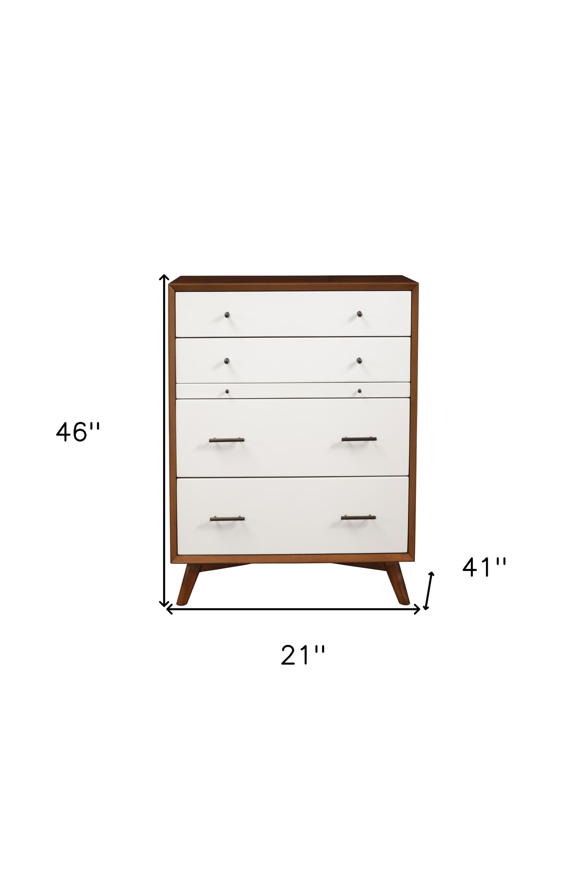 This 38" brown and white solid wood four drawer standard chest is a practical and good looking accent for your bedroom storage and organizational needs. This chest of drawers is tall and lean making it an ideal choice for smaller rooms or as an additional storage option in larger rooms. Equipped with four easy open drawers for practical and good looking clothing storage. This dresser is built to last from high quality solid wood,. 43" H x 38" W x 18" D