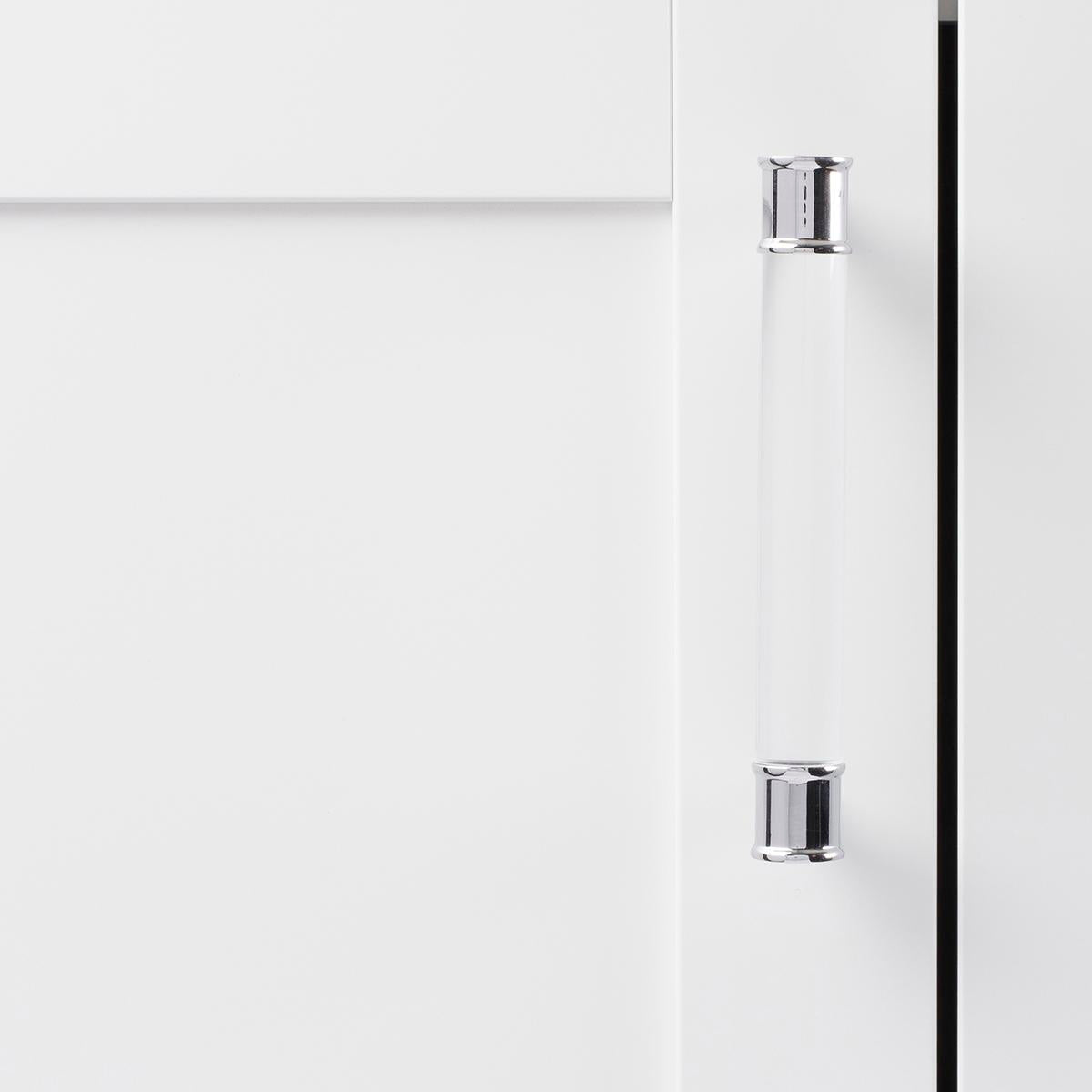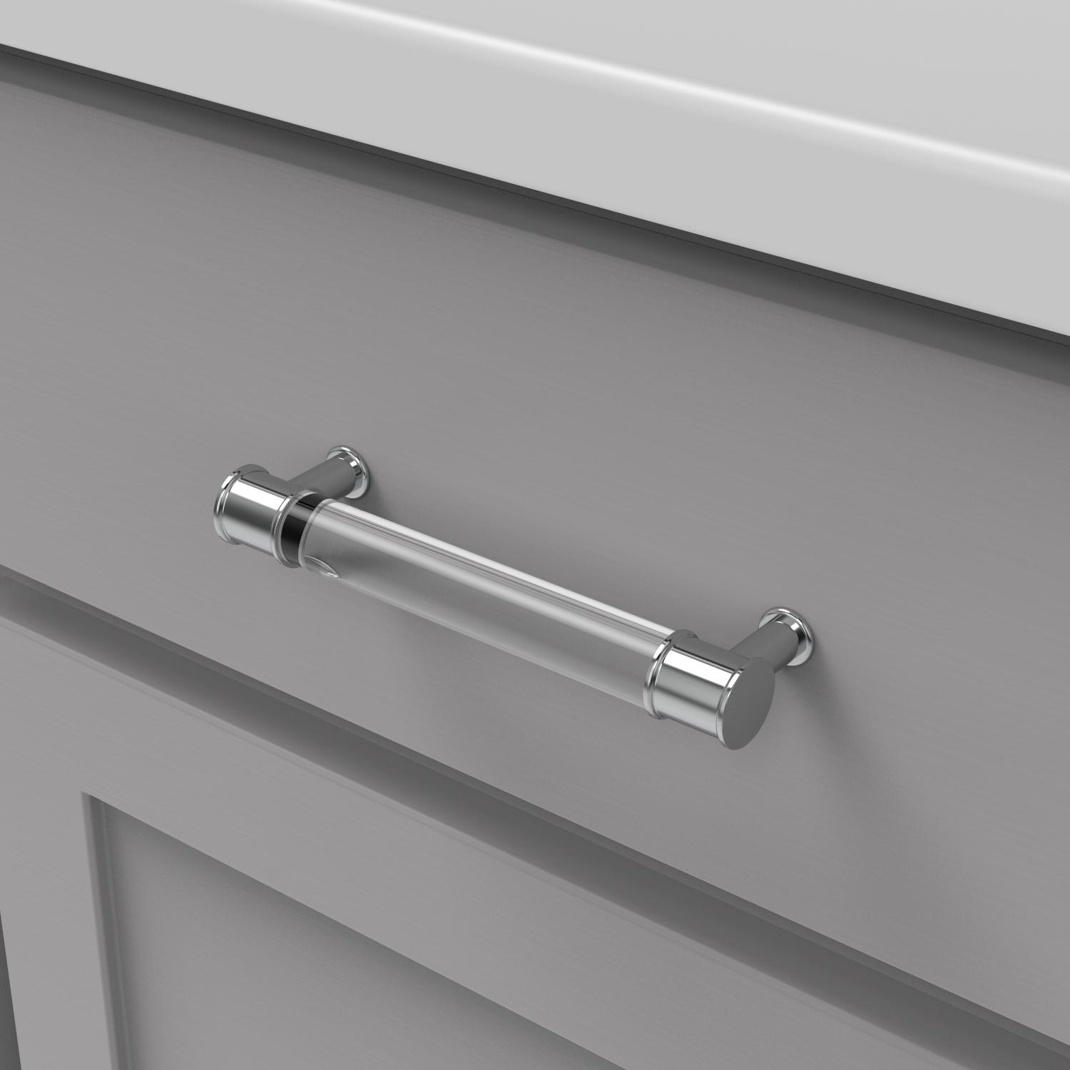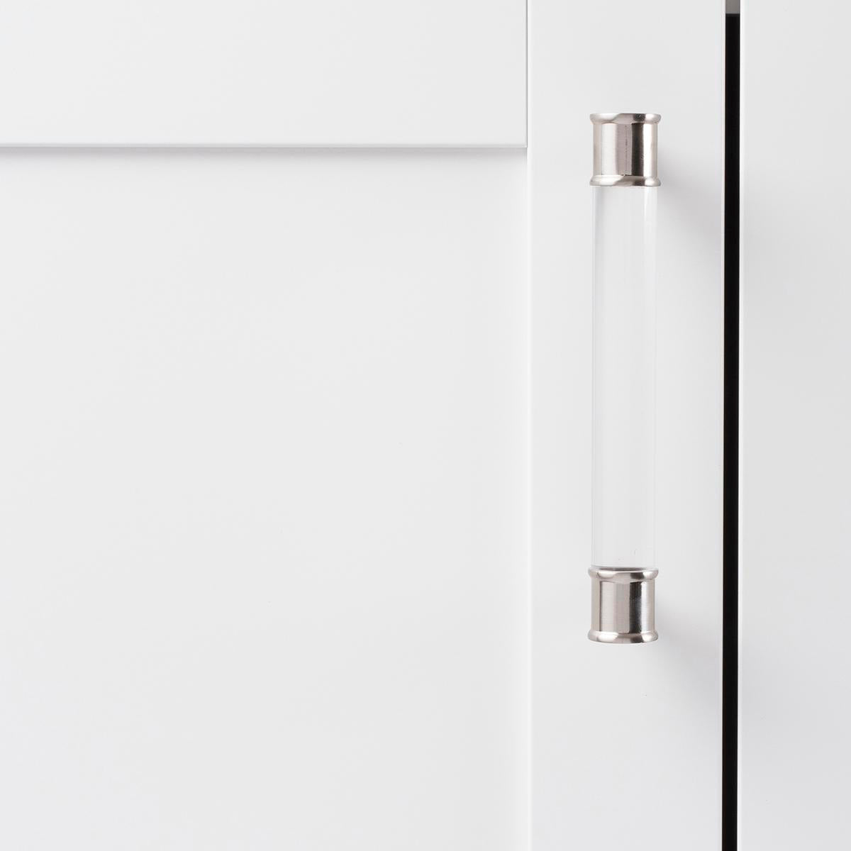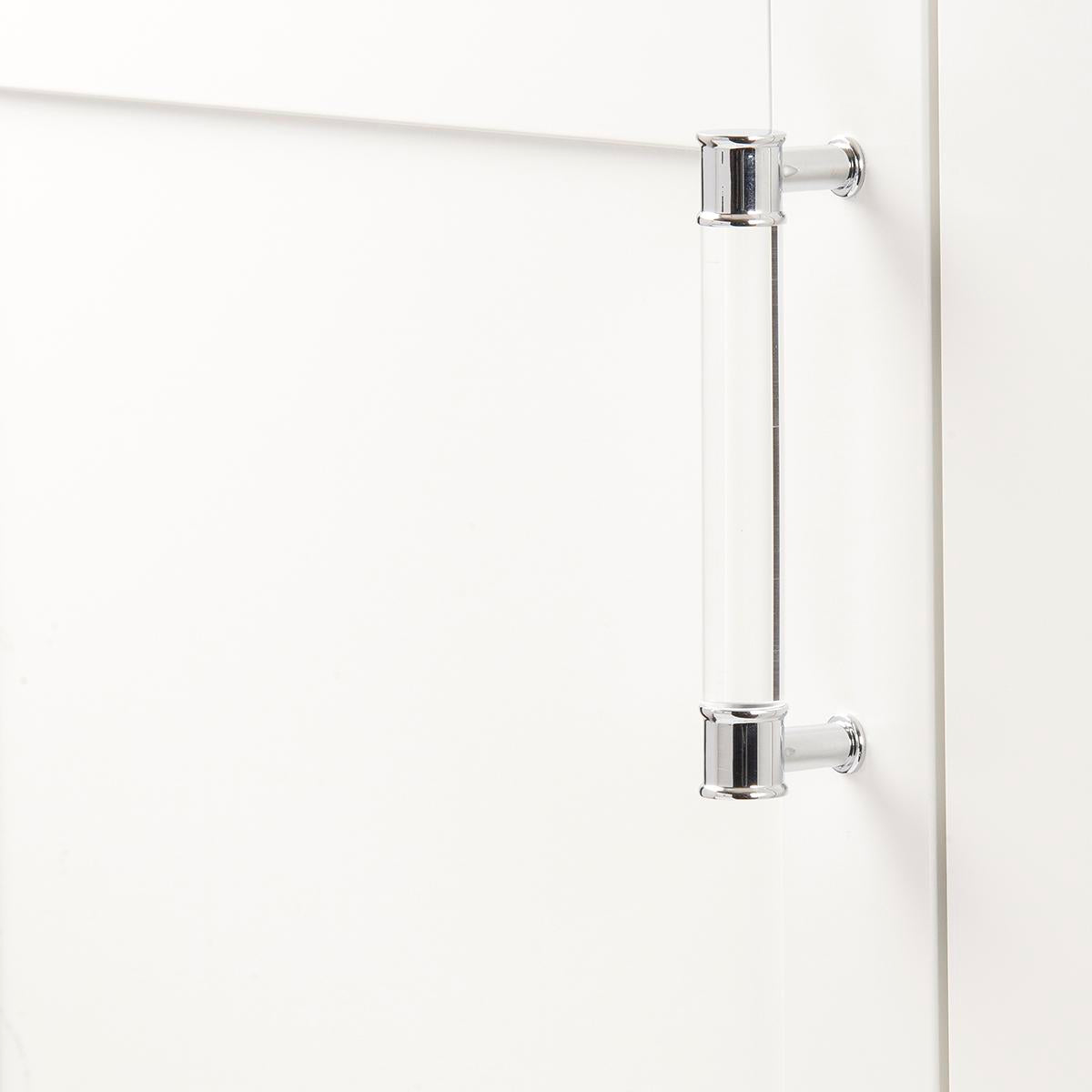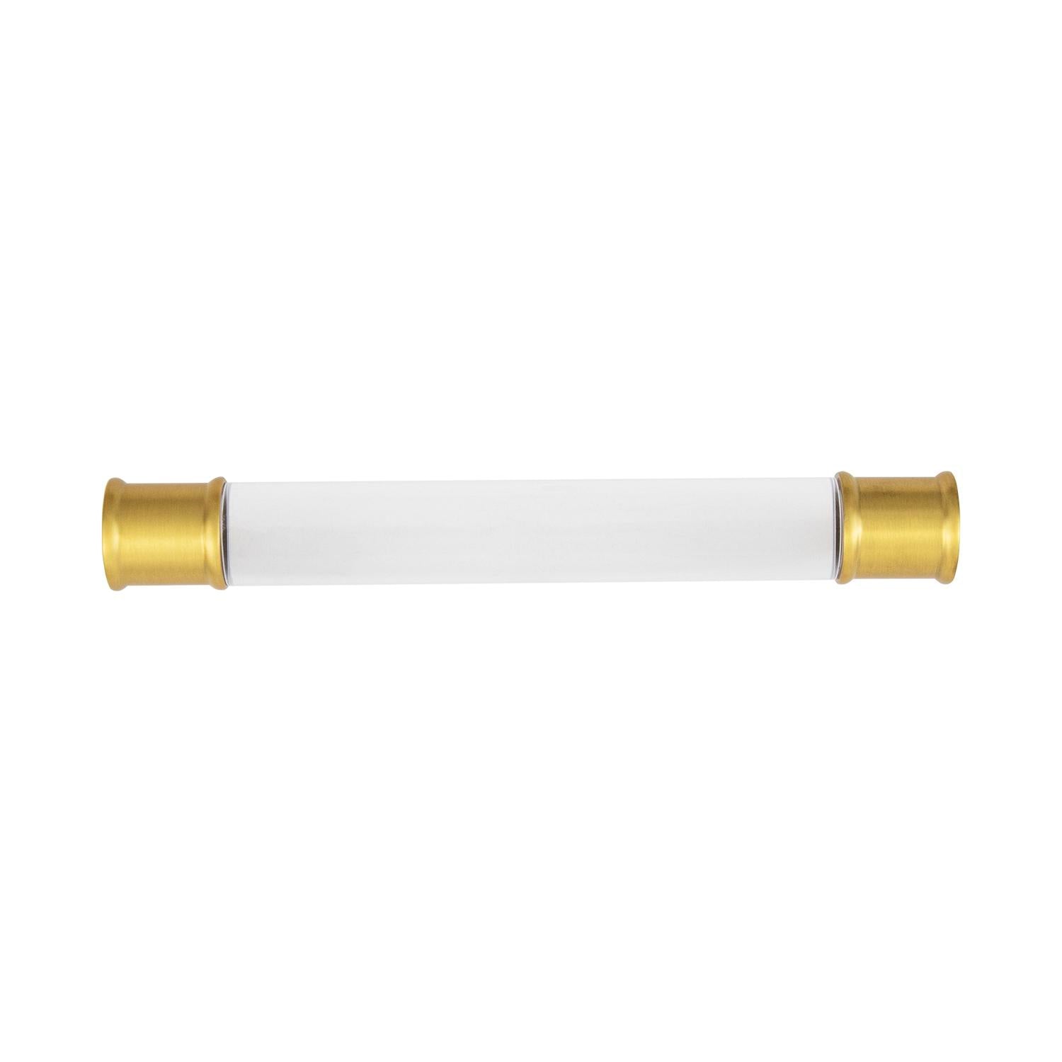 The Crysacrylic accent is a clear acrylic with a glossy sheen that coordinates with other lucite, acrylic, and glass elements. The Brushed Golden Brass base finish coordinates with most Brass and Gold finishes. The color is a rich brass tone and the finish features lengthwise brushing and a stain sheen.