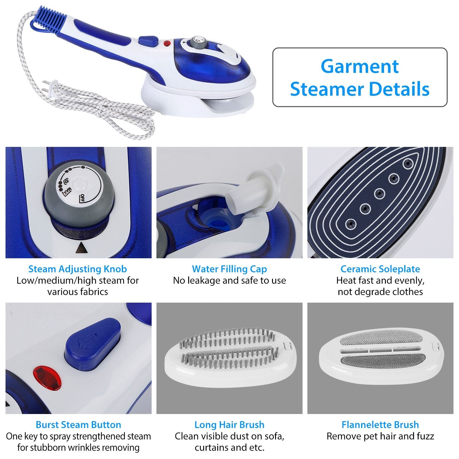 2 In 1 Garment Steamer: This handheld steamer supports both flat and hanging ironing. It can be applied to curtains, beddings, tablecloth and clothes flexibly. Two add-on brushes eliminate dust and fluff.