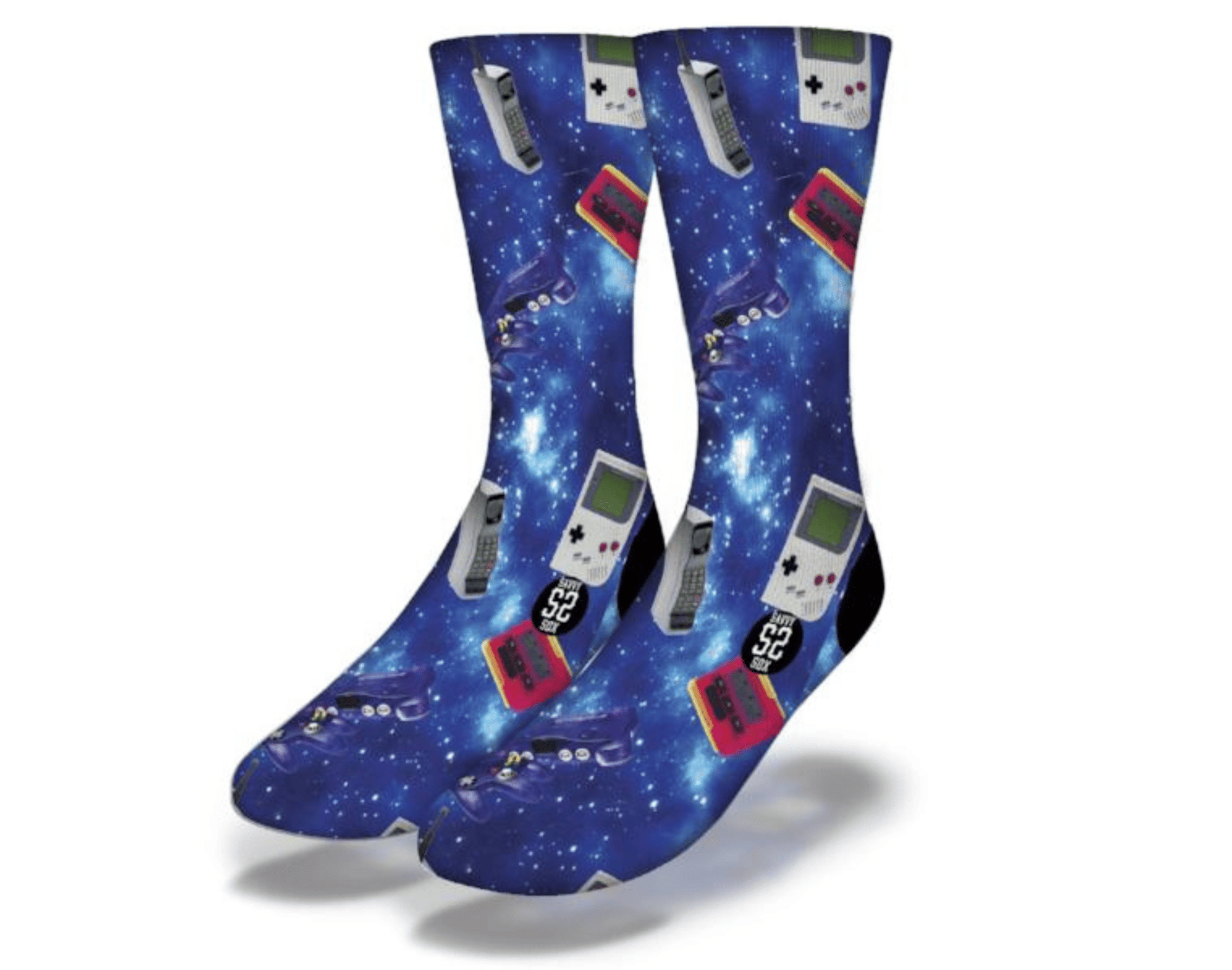 NOSTAGLIA WITH RETRO HANDHELD GAMING CONSOLES IN A SWIRLING 80's GALAXY OF BLUE! CLASSIC NINTENDO AND PLAYSTATION VIDEO GAME THEMED SOCKS! GG!