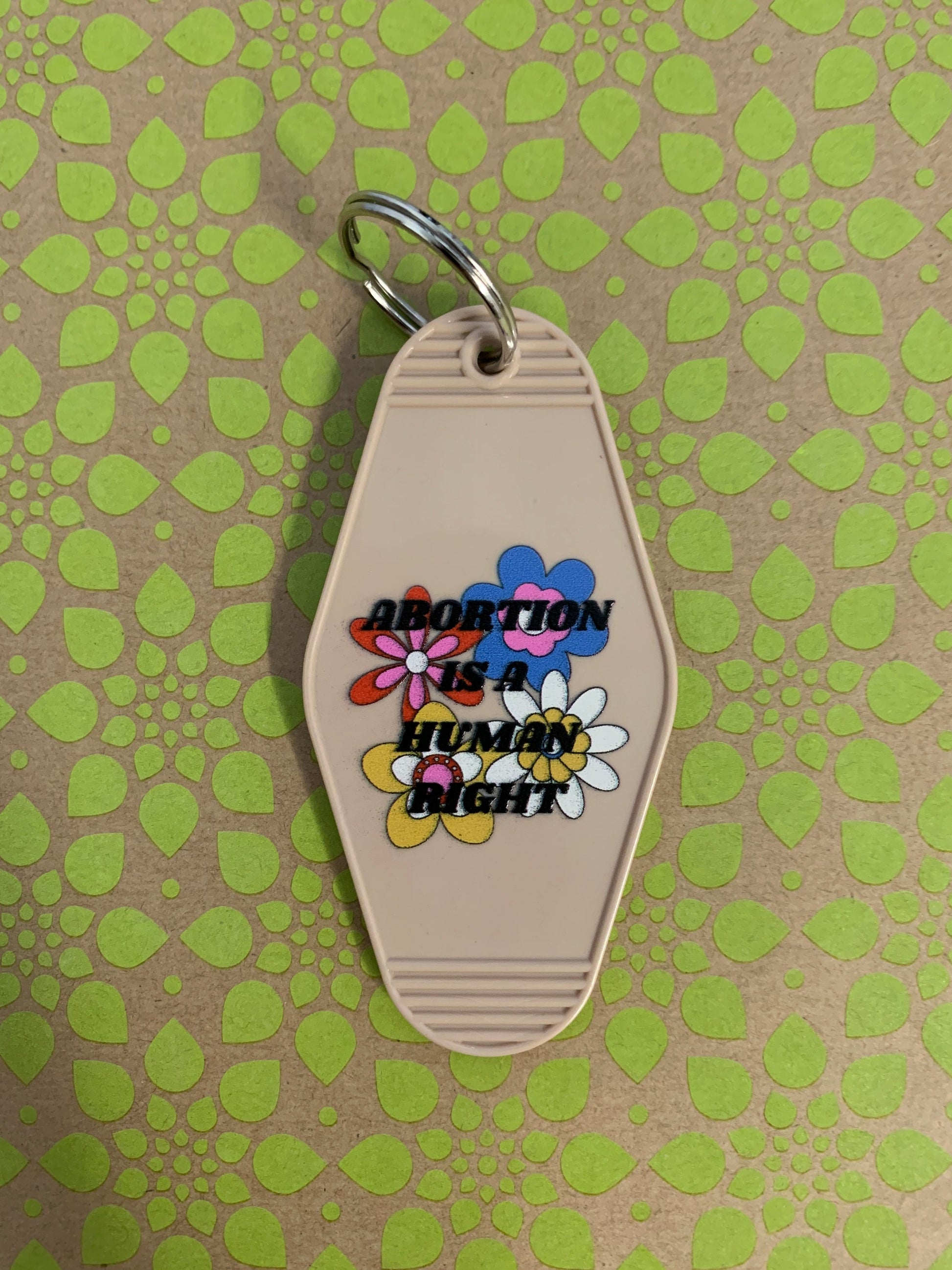 Groovy flower keychain reads ABORTION IS A HUMAN RIGHT.