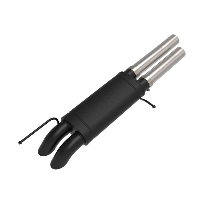This cat-back exhaust system has a turn down tip under the vehicle, before the rear axle, to take on rough terrain and off-road obstacles. No more smashed or lost tips to worry about. A free-flowing stainless steel muffler with internal “X” is used to absorb high pitch tones producing a powerful sound and unleashing all available horsepower and torque. This exhaust system uses all factory mounting locations, and quality hardware for a 360-degree sealing surface and hassle-free installation. Factory style hangers are used to maintain a stable pipe location during high vibration and high heat conditions. The bayonet tip holds the hanger bushing in place for a long lasting, factory style fit.