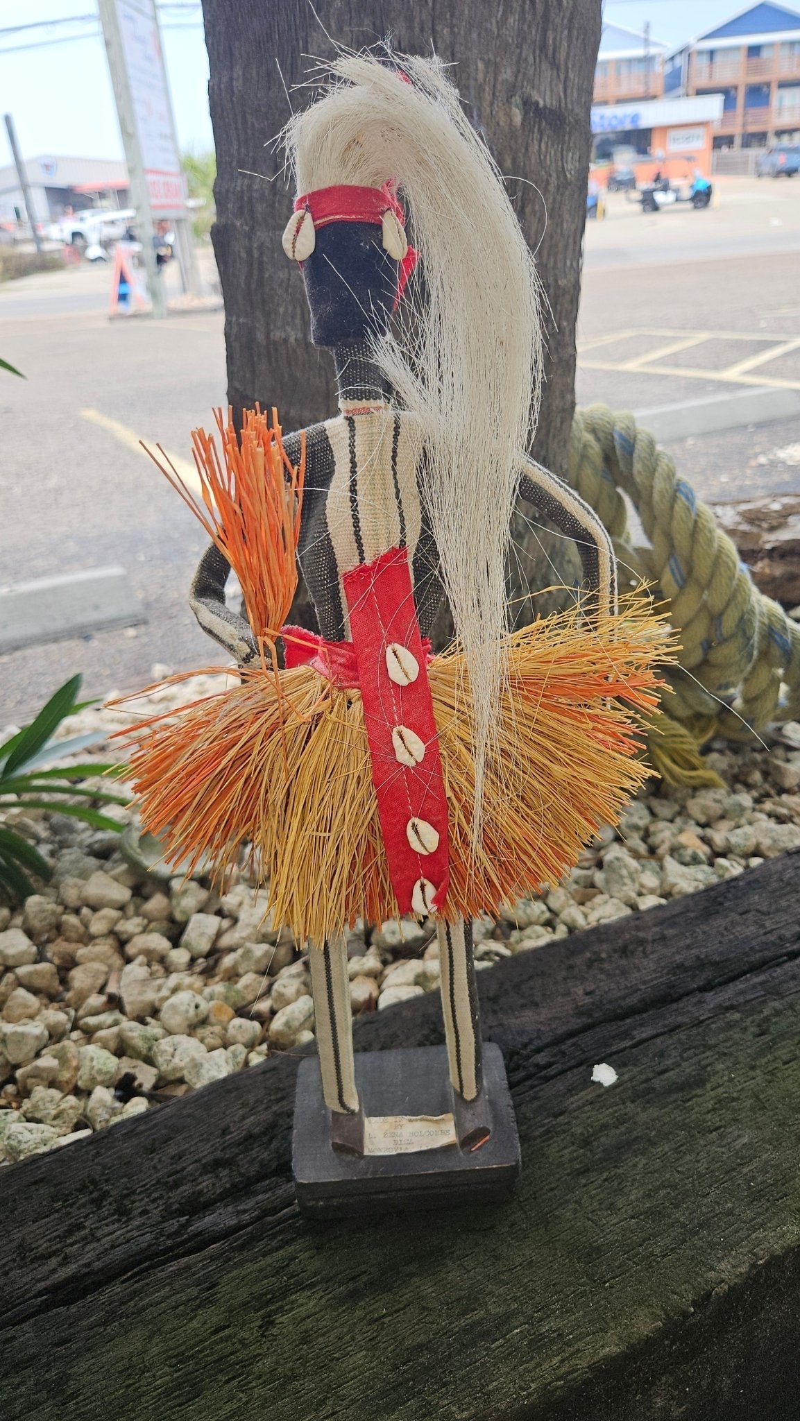 - Design Features: Features a bold and colorful tribal outfit, complete with a straw skirt, cowrie shell embellishments, and a dramatic headdress. The doll is mounted on a sturdy wooden base for display.