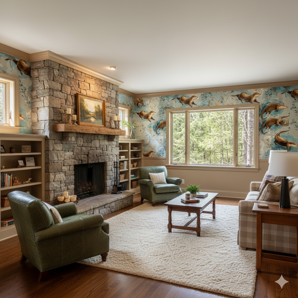 Playful yet sophisticated, Alderbrook Run is a love letter to riverside vitality. Sleek brown otters twist and swim through painterly blue waters, surrounded by drifting reeds and abstract reflections. The brushwork feels fluid and spontaneous, as if painted directly on a moving current. This design brings energy and life to any space, especially bathrooms, mudrooms, or children’s rooms that want a sense of adventure without losing refinement. The color palette — amber, sky, and sand — pairs effortlessly with white tile, stone, or rustic wood, creating a fresh, organic aesthetic that still feels elevated.