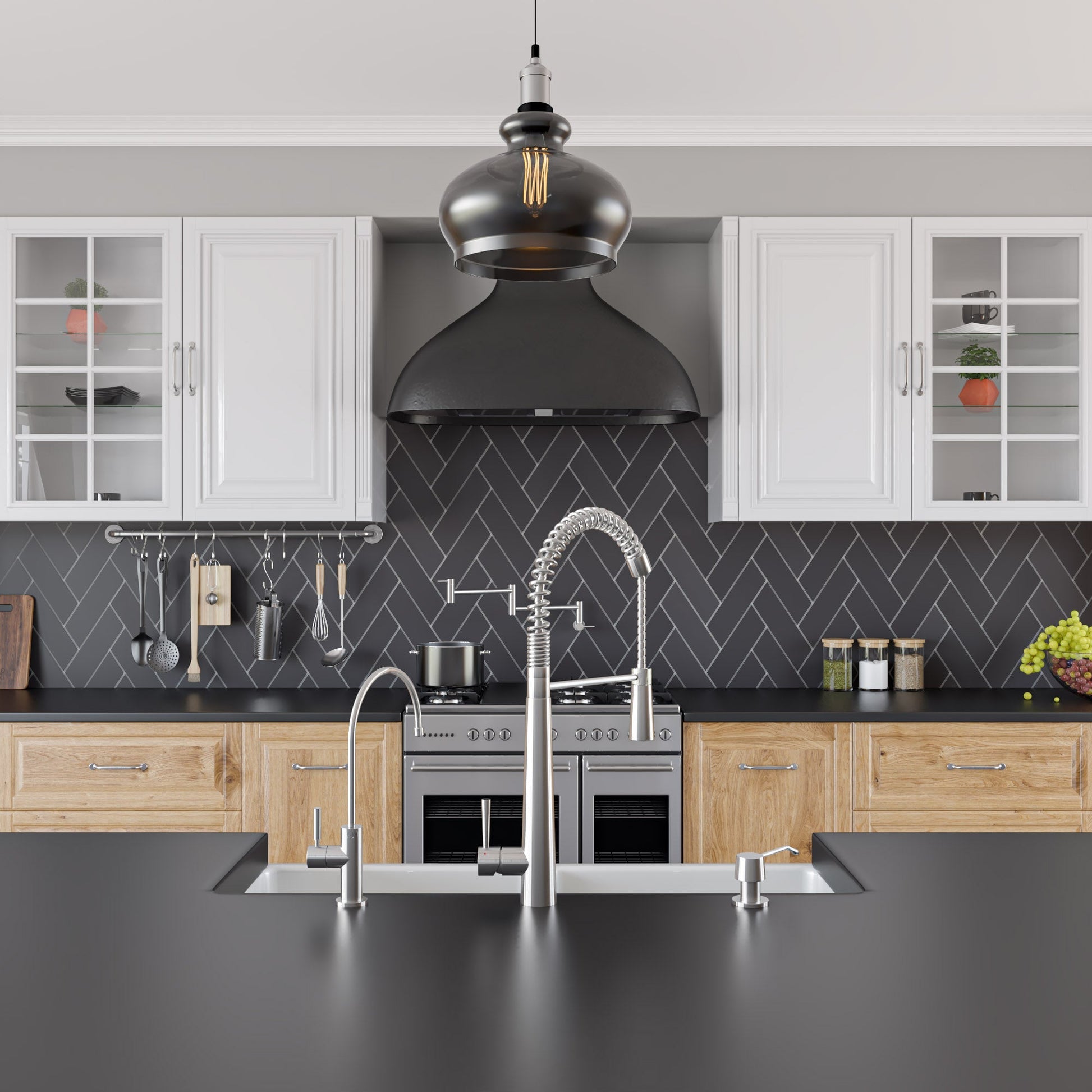 - Commercial-style kitchen faucet with spring + arm to hold the head which can be pulled down to wash large areas.