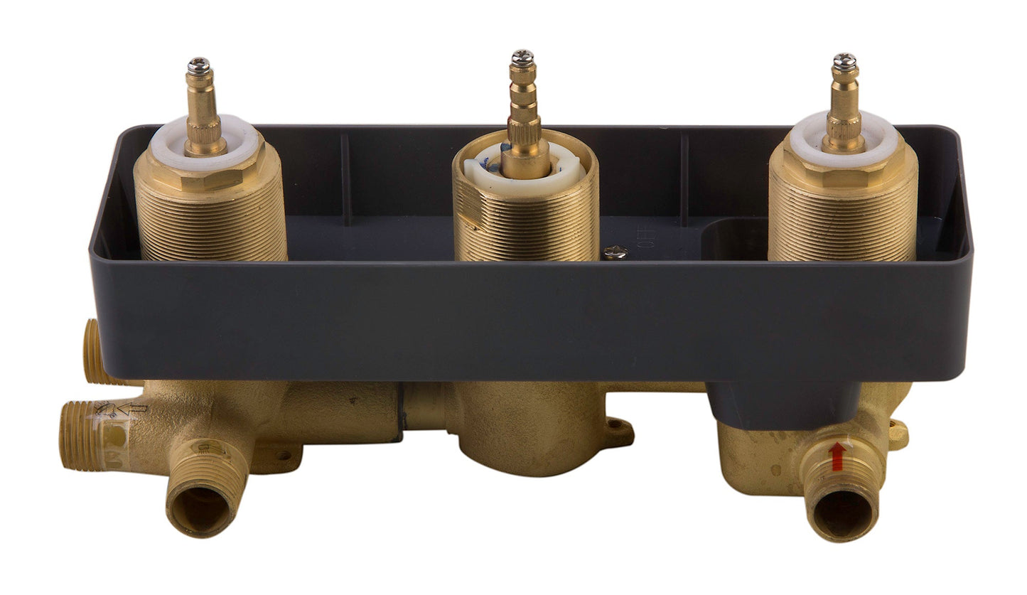 - A thermostatic valve allows you to have separate temperature and pressure controls, allowing you to leave the water on a certain temperature and turn your water on and off separately