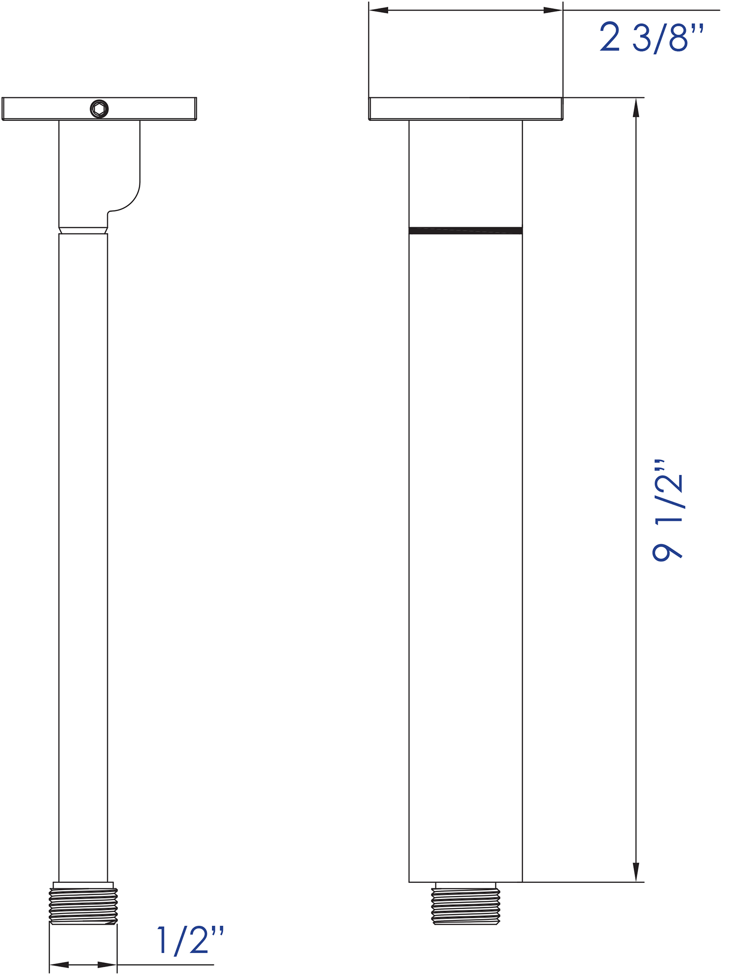 - 1/2" NPT male threading at the bottom to the shower head and 1/2" NPT female threading at the top, to connect to water supply.