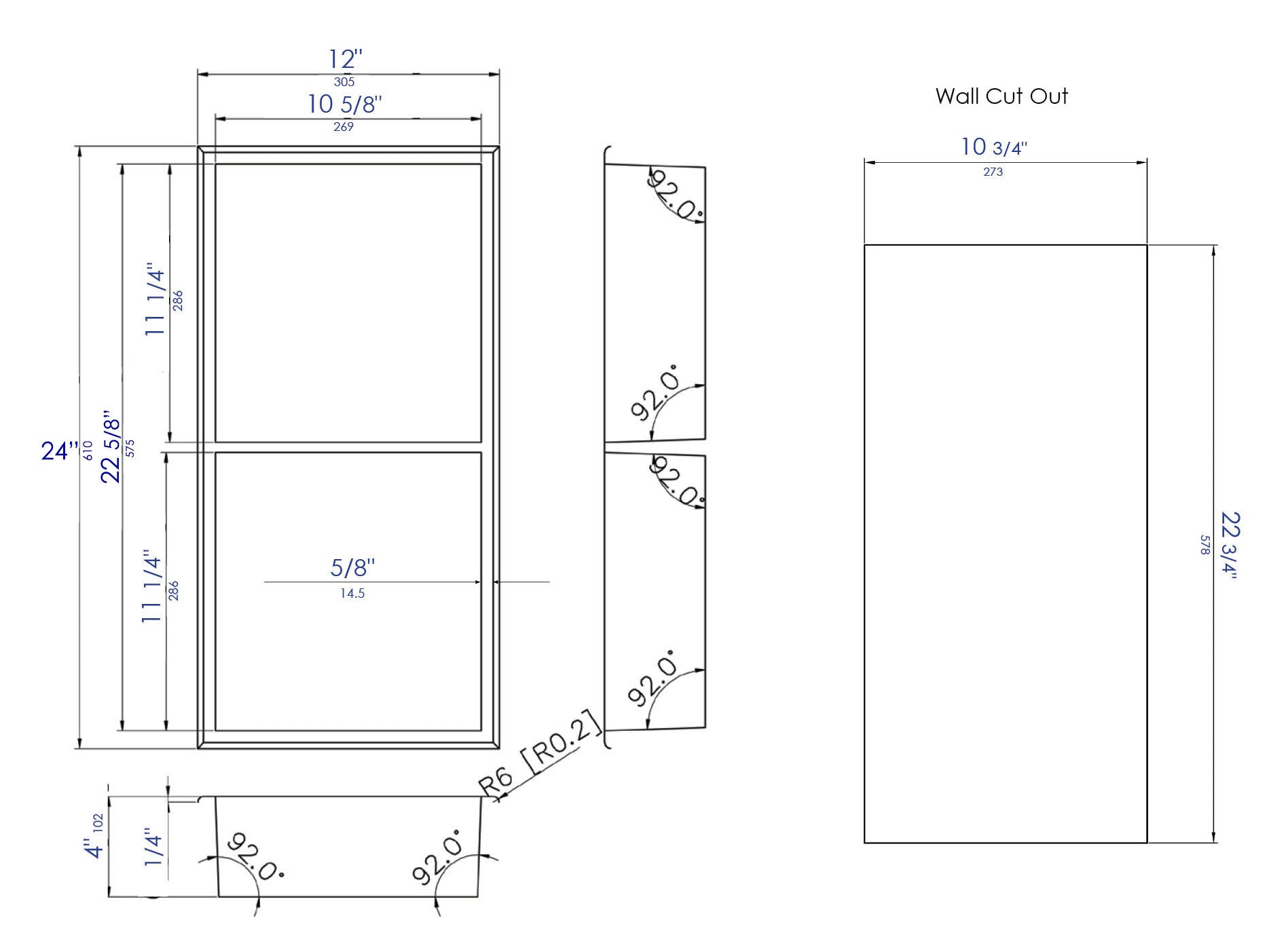 - Interior Size of each Shelf: 10 5/8" x 22 5/8" x 3 7/8". The wall cut out dimensions are 10 3/4" x 22 3/4"