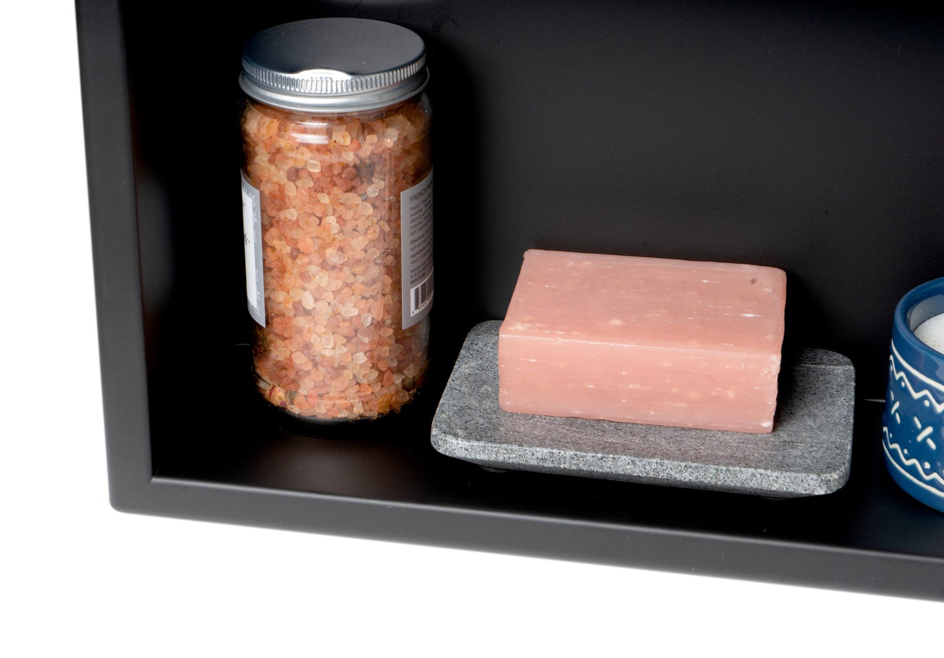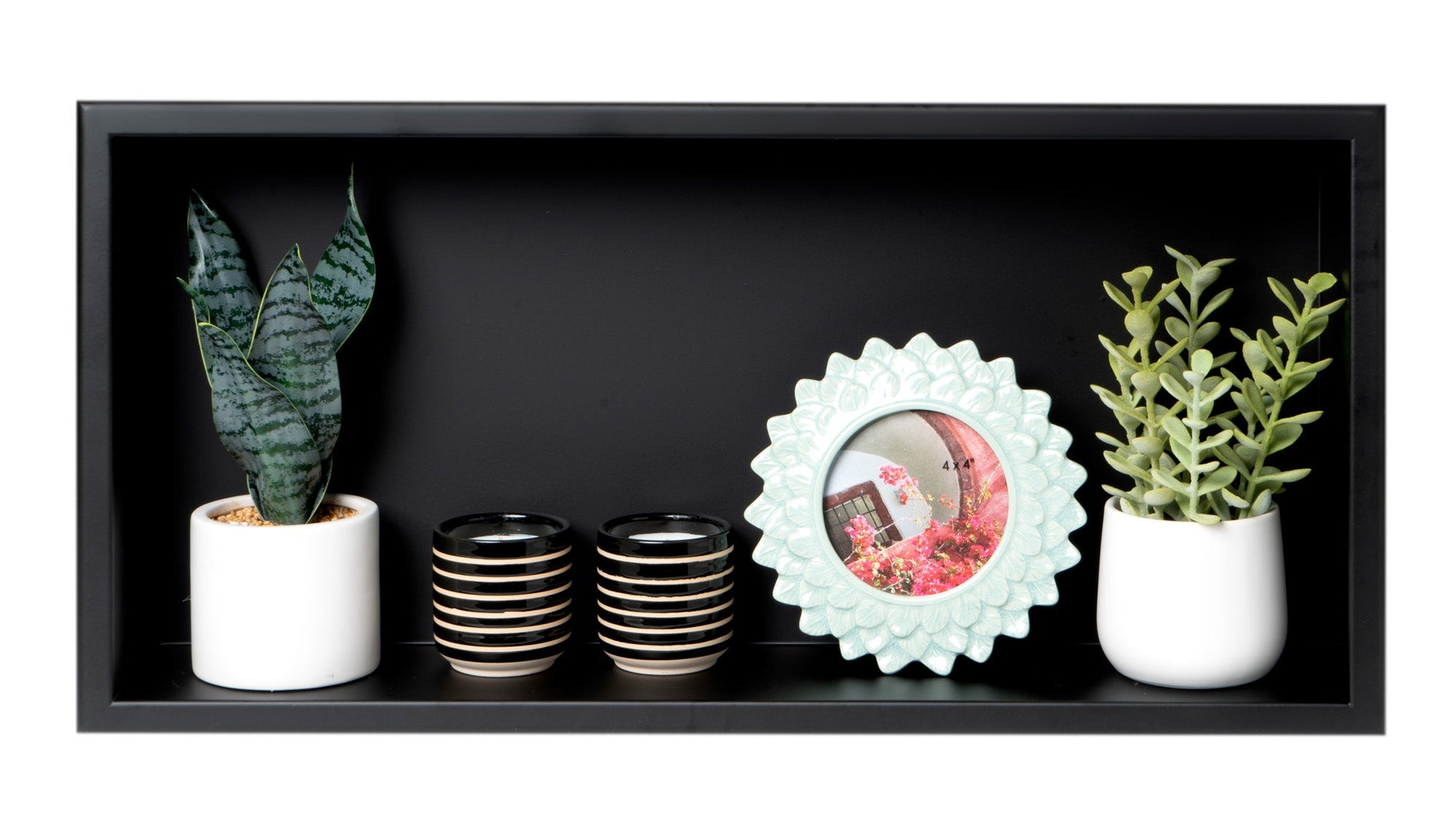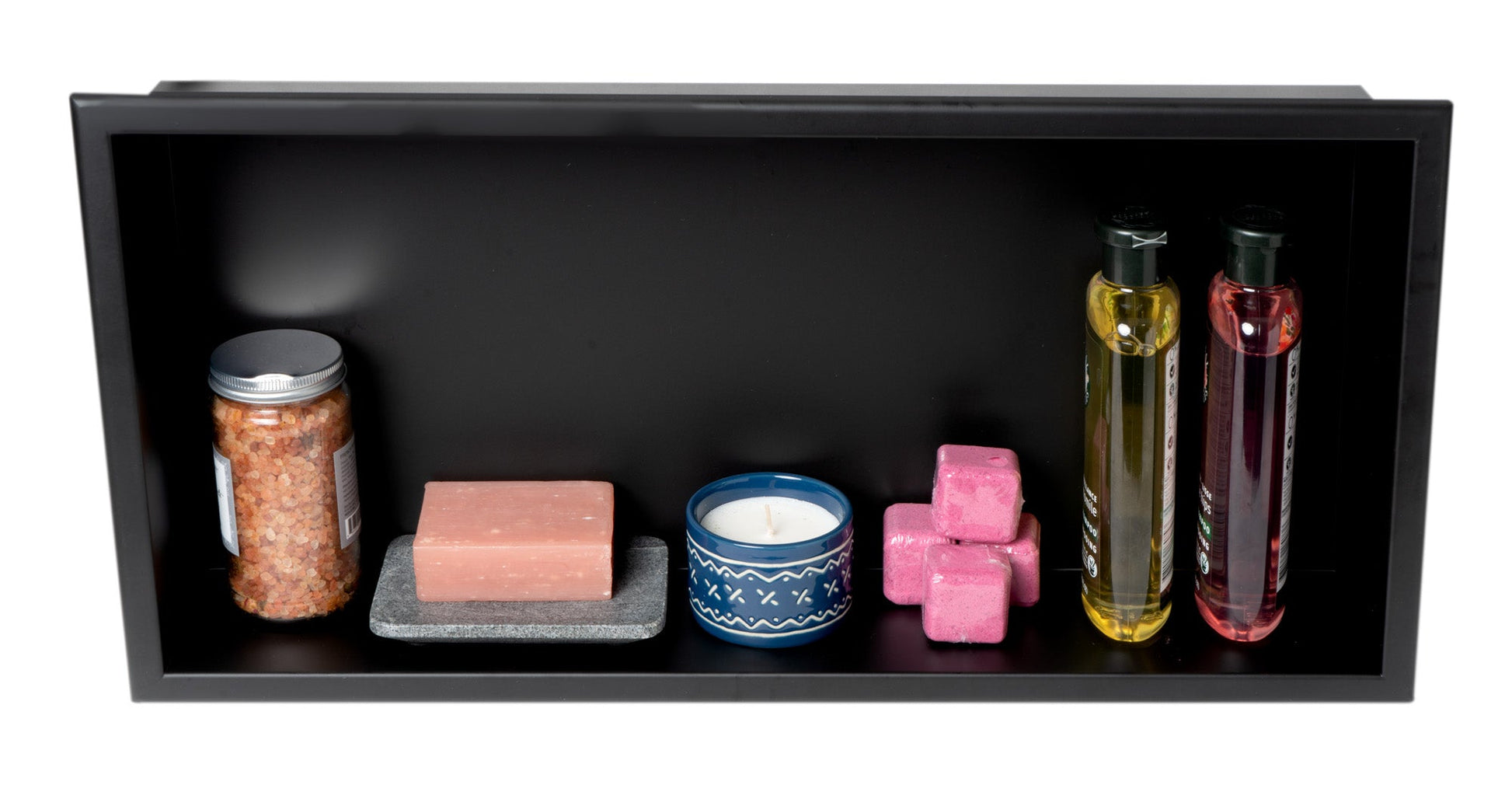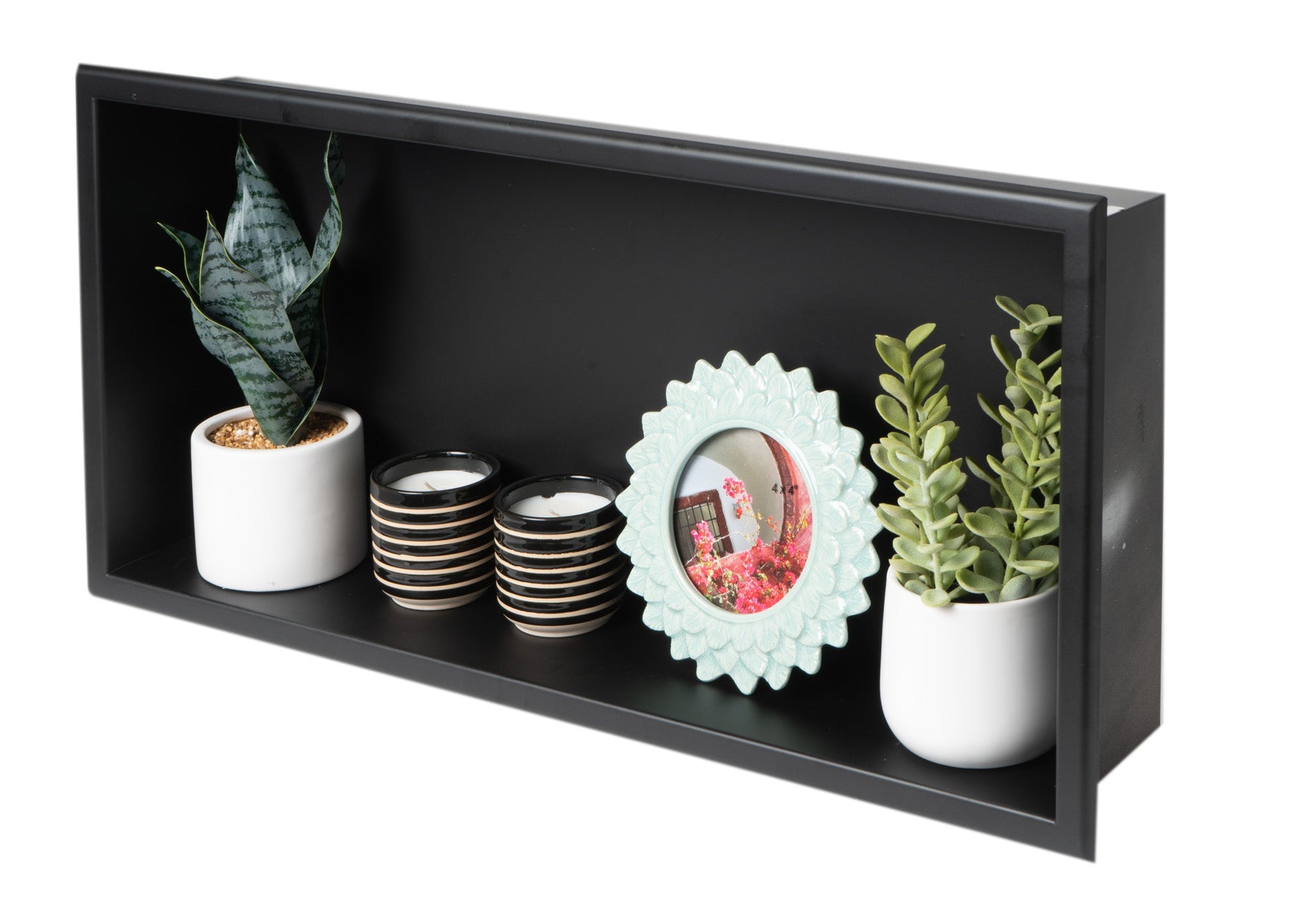 - Not just for your shower! This recessed niche adds convenient space to use for storage, decor or more. The neutral matte black color makes this niche the perfect modern choice for easy to install recessed shelving anywhere. The black color makes a statement and can become a center piece that matches effortlessly with other matte black hardware.