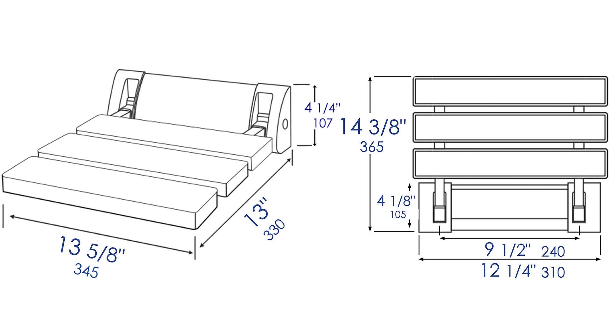 - When folded the seat sticks out from the wall by 2" at its widest point.
