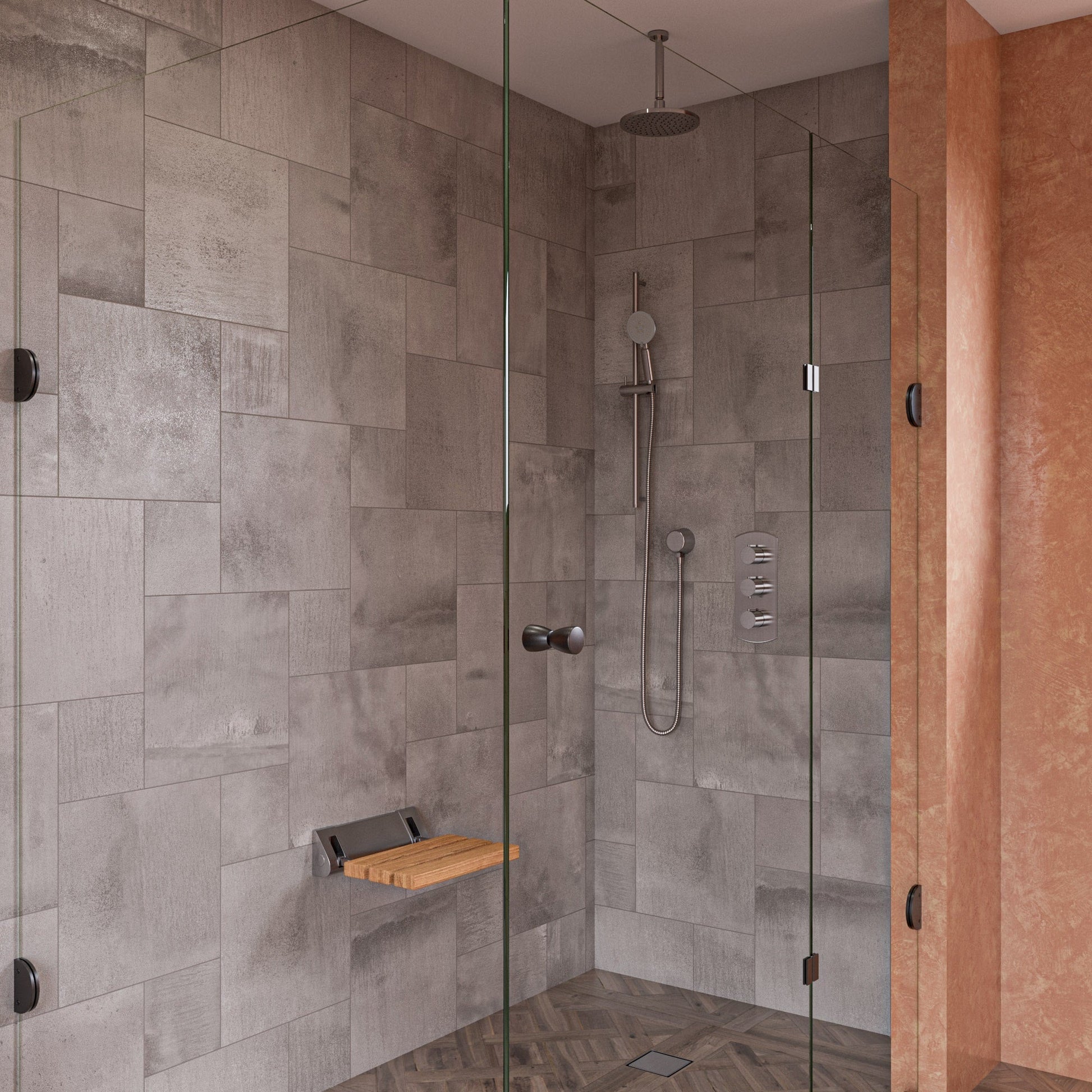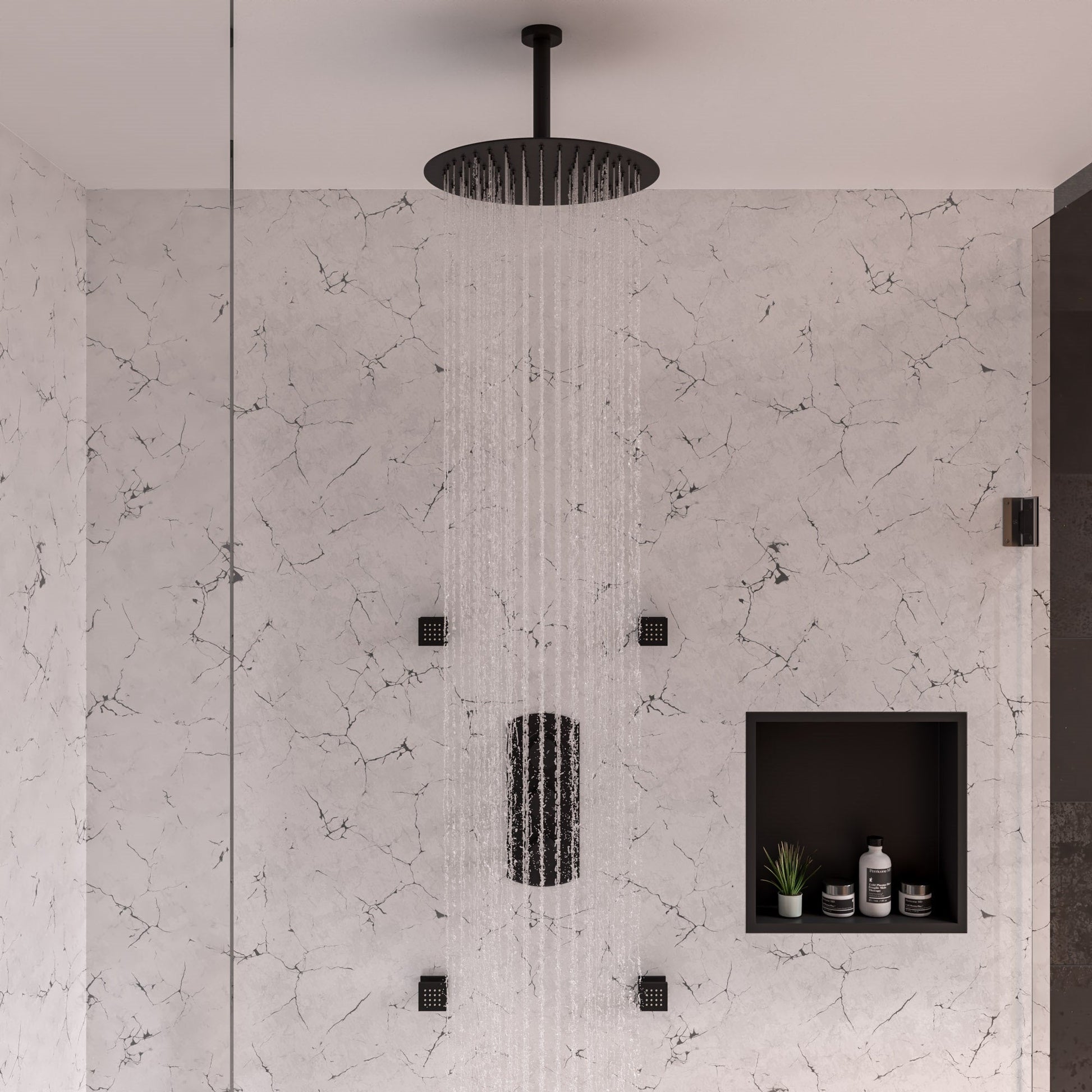 - Designed to be mounted to the ceiling directly above your shower drain.
