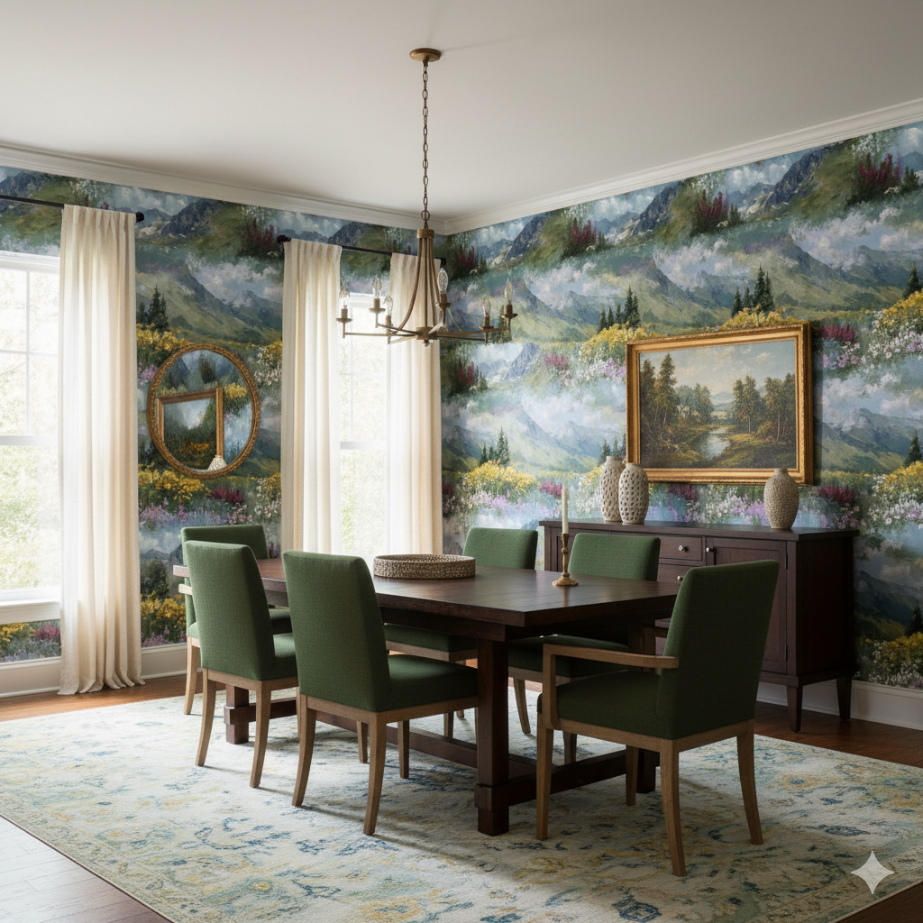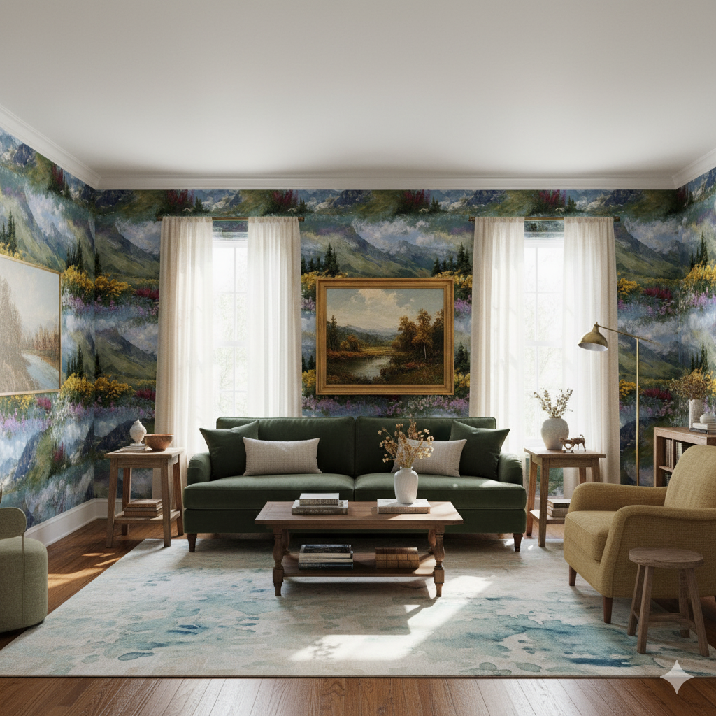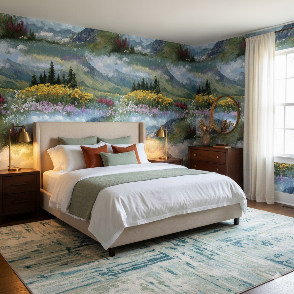 This design bursts with meadows of wildflowers — yellow, pink, purple, and white blossoms stretching into mountain slopes of green and violet shadows. The painterly brushstrokes capture not only the flora but also the atmosphere of high-altitude air, crisp and refreshing. It’s dramatic but not overpowering, a balance of grandeur and intimacy. Perfect for a sunroom, garden room, or hospitality space, Alpine Bloom can shift depending on styling: rustic lodges will emphasize its pastoral charm, while contemporary interiors will lean into its lush, painterly modernism.