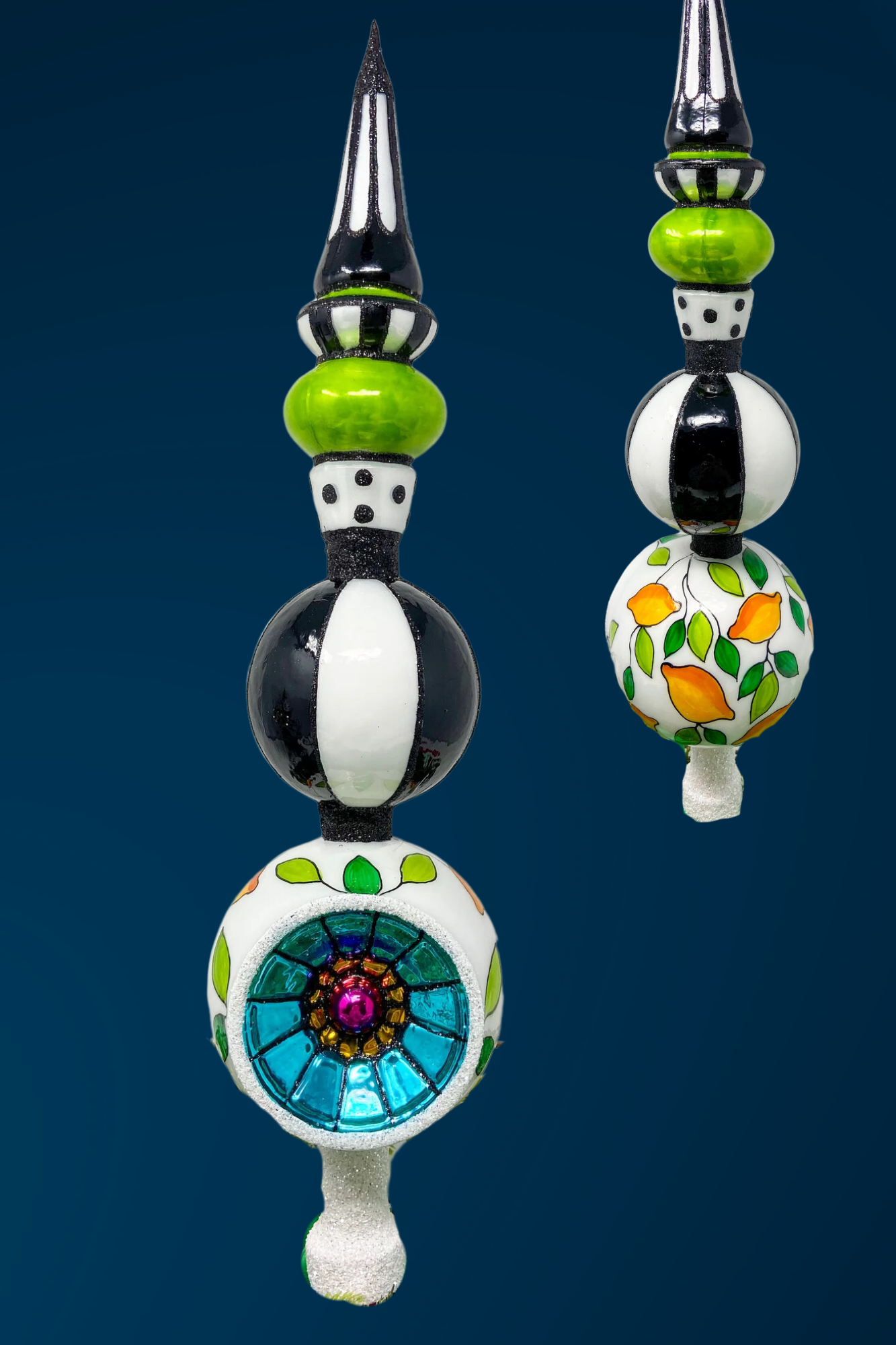 Like a citrus grove kissed by couture, this hand-blown topper is part fruit stall, part fashion house. With bold black-and-white banding, a juicy swirl of lemons, and a turquoise reflector that glows like the Amalfi coast at noon, it’s a Mediterranean daydream perched at the peak of your tree.