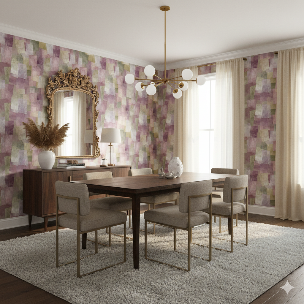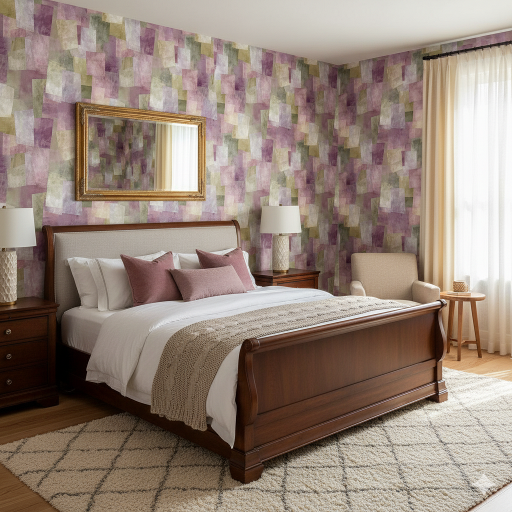 This design layers soft blocks of mauve, dusty lilac, pale sage, and parchment beige, evoking the look of fractured gemstone slabs stacked against each other. The surface has the painterly texture of brushed mineral pigment, giving it both richness and depth. It feels refined yet slightly rugged, a modern cubist interpretation of stone mosaics. Perfect for creating an artistic feature wall in contemporary lofts, eclectic dining rooms, or jewel-toned bedrooms, it brings a grounded elegance without being overly busy. The muted but varied palette pairs seamlessly with brushed brass, soft linens, or dark wood accents, lending a refined but approachable atmosphere.