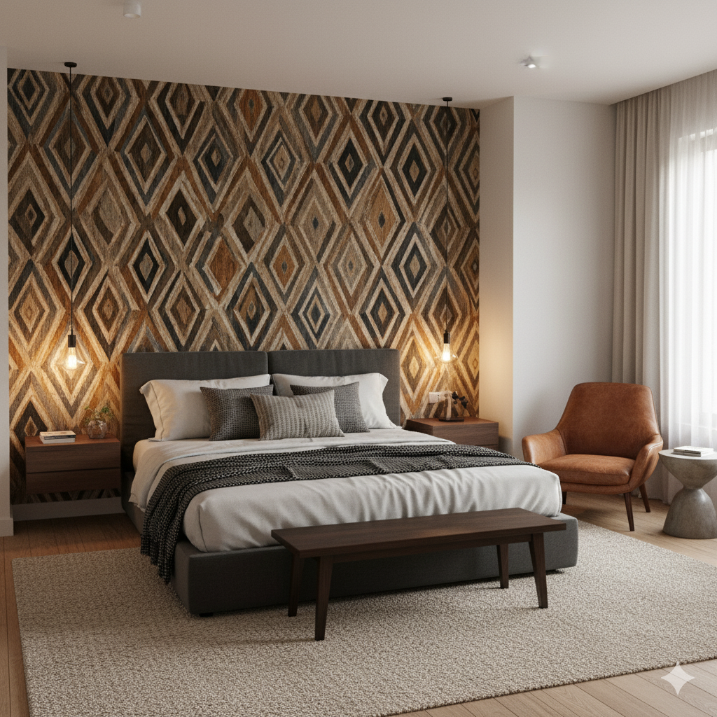 Diamond motifs interlock across the surface in layers of umber, charcoal, tan, and warm brown. The irregular brushstrokes suggest handwoven cloth or tribal shields, with a rhythmic geometry that is both protective and decorative. The pattern carries the tactile strength of textiles while bringing depth and structure to walls. Perfect for cozy dens, masculine home offices, or rustic cabins, this wallpaper anchors a space with earthiness and gravitas. Its palette complements leather upholstery, wool throws, and natural wood furniture.