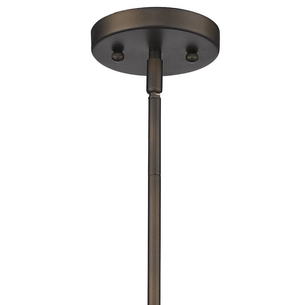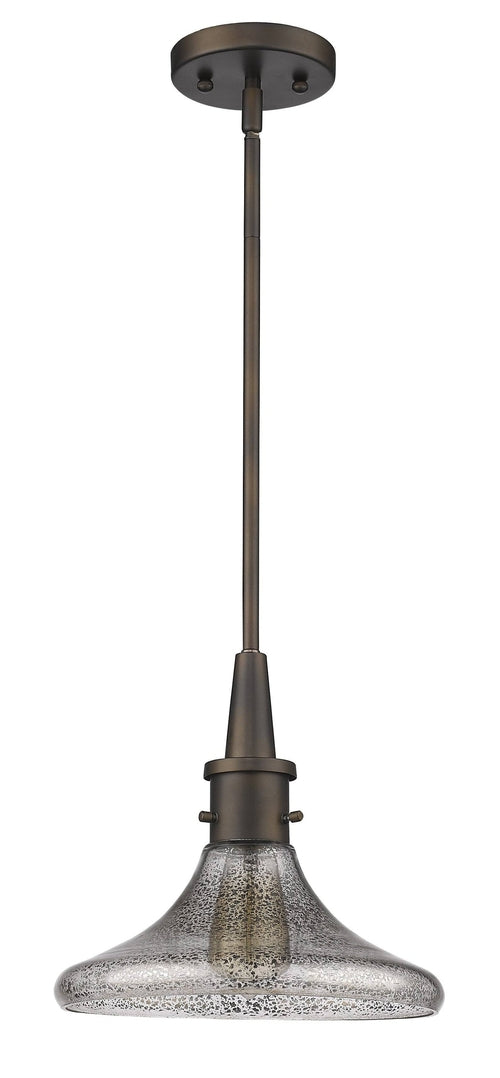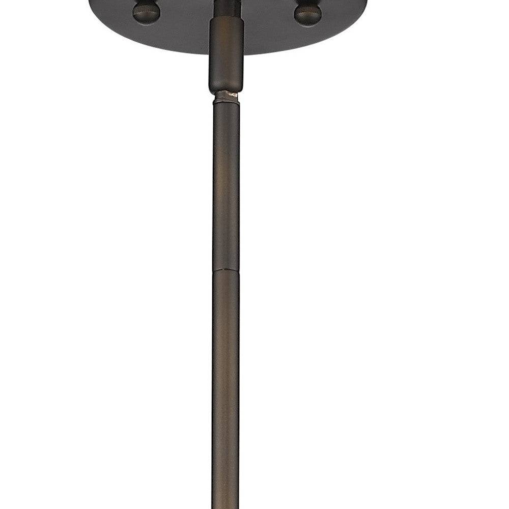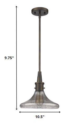A modern take on a classic design, this Antique Bronze Hanging Light with Pebbled Glass Shade will elevate the look of any space in your home. The ceiling bracket has a slightly simple design and is made of a round piece of bronze metal. The bracket is attached to the top of the main light by a bronze metal rod. The top of the light has a tapered conical shape attached to a short cylindrical shape. The bulb is encased in a shallow pebbled glass dome shaped shade. This unique hanging light will look great in your living room, your bedroom, or your home office as a statement light fixture. 9.75" H x 10.5" W x 10.5" D