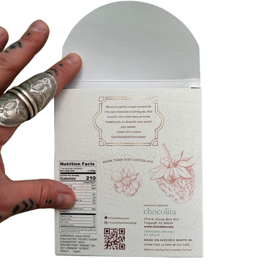 Dark chocolate and strawberries combine with Maca, Damiana, Passionflower, and Ashwaghanda to explode your passions and open your heart.