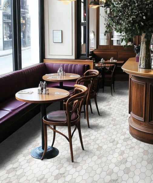Elevate your space with the classic elegance of the Arabescato Venato White 5" Hexagon tile. This stunning tile showcases an intricate hexagonal pattern on a cool white background, enriched with gray and greige veins and a polished finish for a luxurious touch. Crafted for both beauty and ease, its mesh backing allows effortless installation, making it an ideal choice for accent walls, backsplashes, and residential floors in kitchens, bathrooms, laundry rooms, and more. Whether in residential or commercial settings, this versatile tile adds a vibrant burst of color and a refined sense of sophistication to any space.