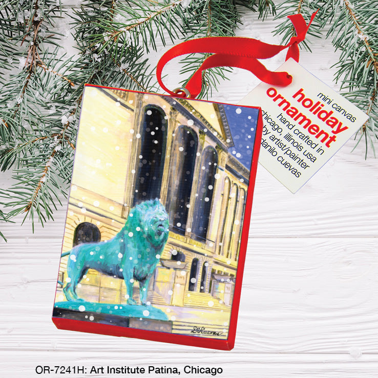 Art Institute Patina, Chicago, Ornament (OR-7241H) is made in the USA from oil paintings by artist, Danilo Cuevas. Miniaturized images mounted on a mini canvas. Each arrive with a red ribbon strand for easy hanging and display.