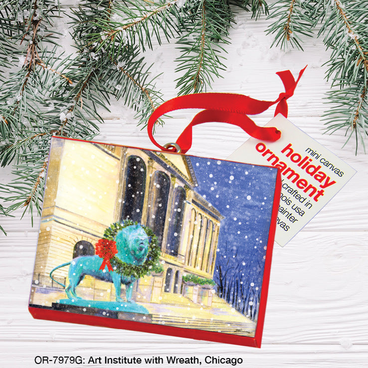 Art Institute with Wreath, Chicago, Ornament (OR-7979G) is made in the USA from oil paintings by artist, Danilo Cuevas. Miniaturized images mounted on a mini canvas. Each arrive with a red ribbon strand for easy hanging and display.