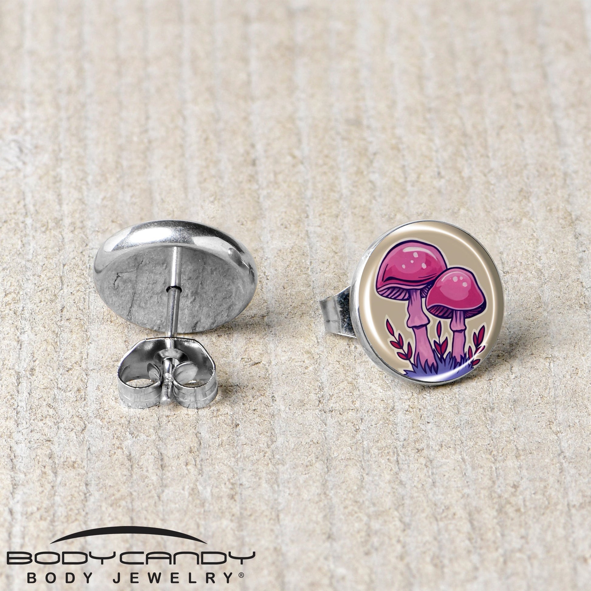 Make room for shrooms with these trippy stud earrings for pierced lobes. They're made with stainless steel straight posts with friction backs for a secure fit. Each one features a disc logo charm with a beige background. They feature extravagantly pink and purple mushrooms, happily growing in a field. Let these funky fungi give you psychedelic style with these colorful pierced earrings. Sold as a set of two.