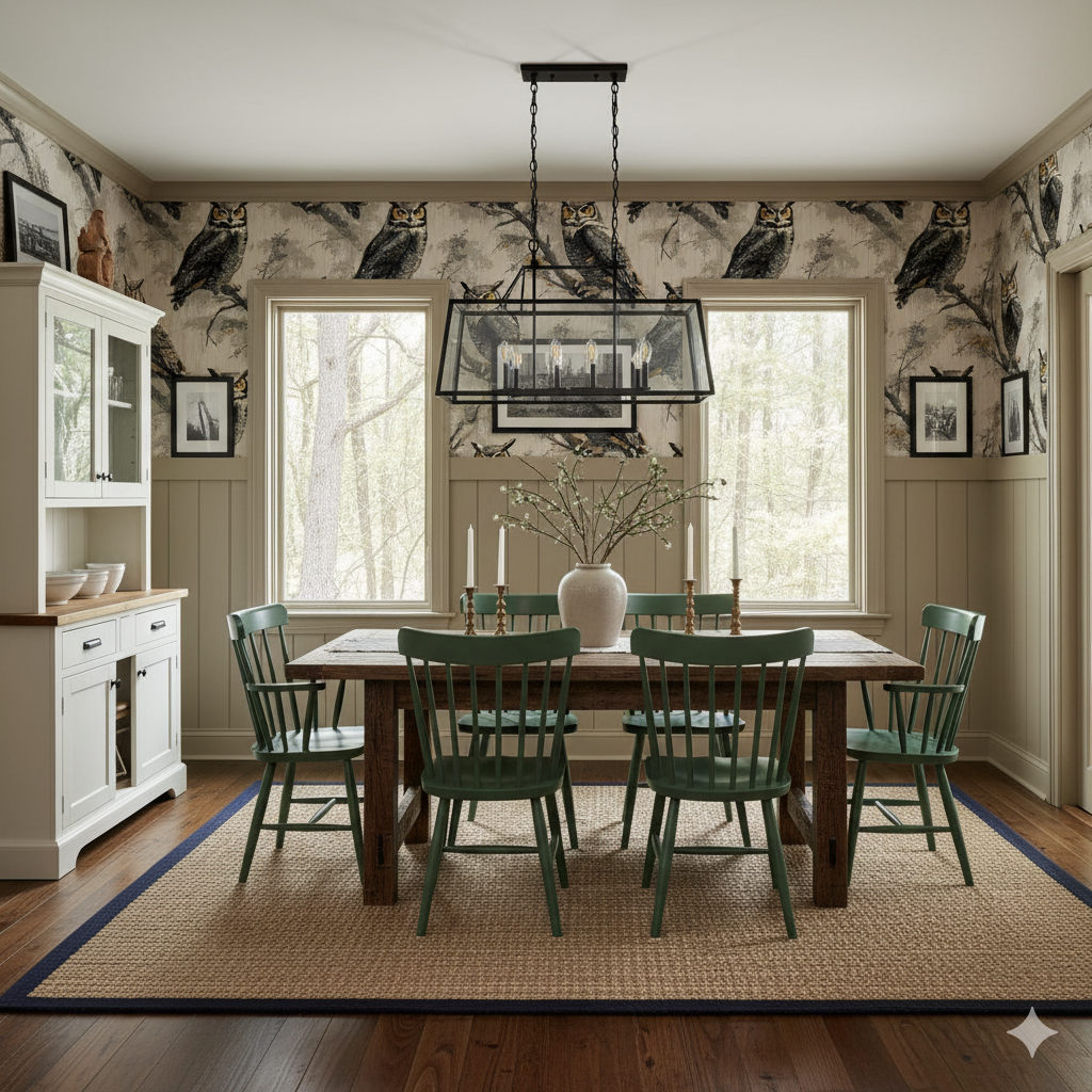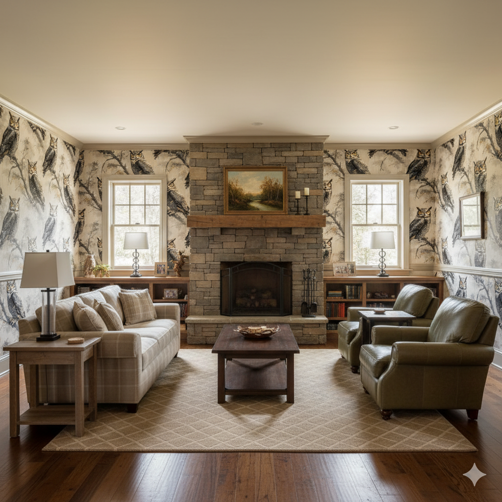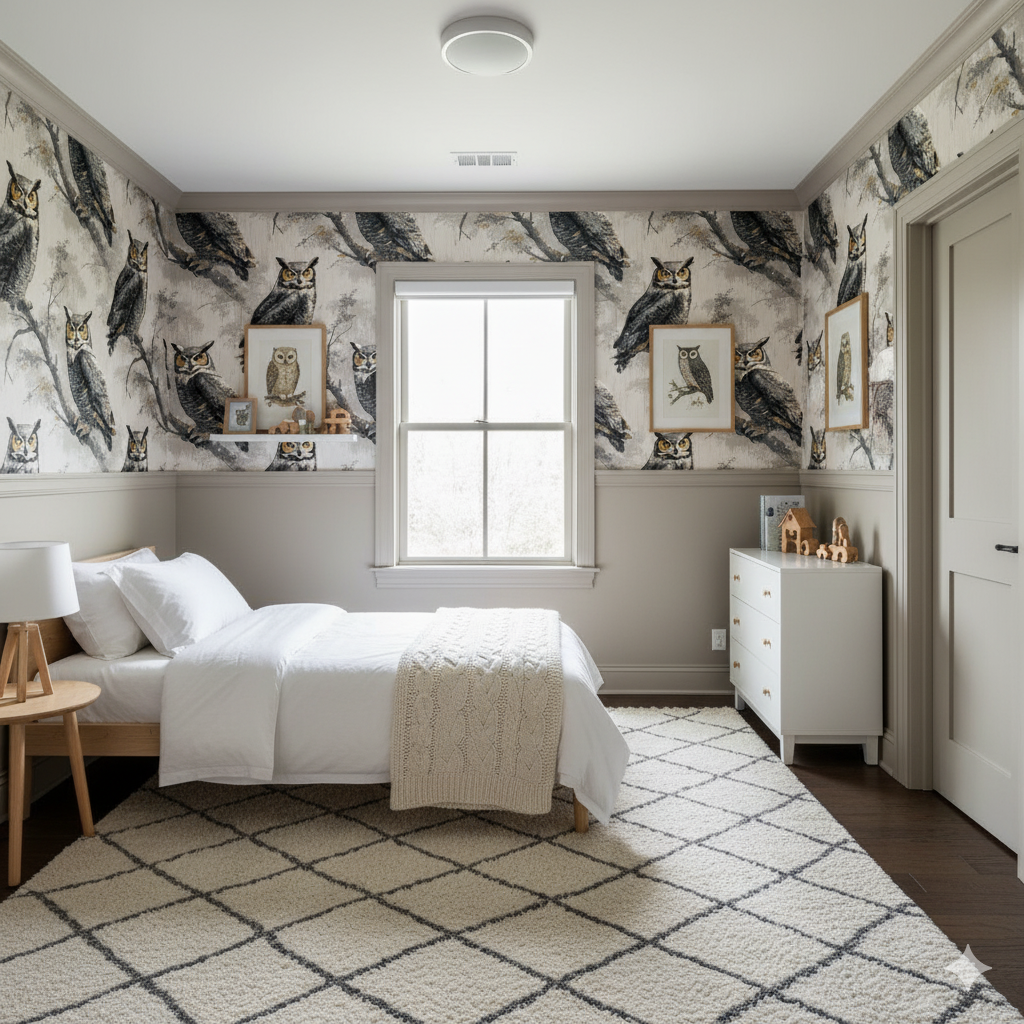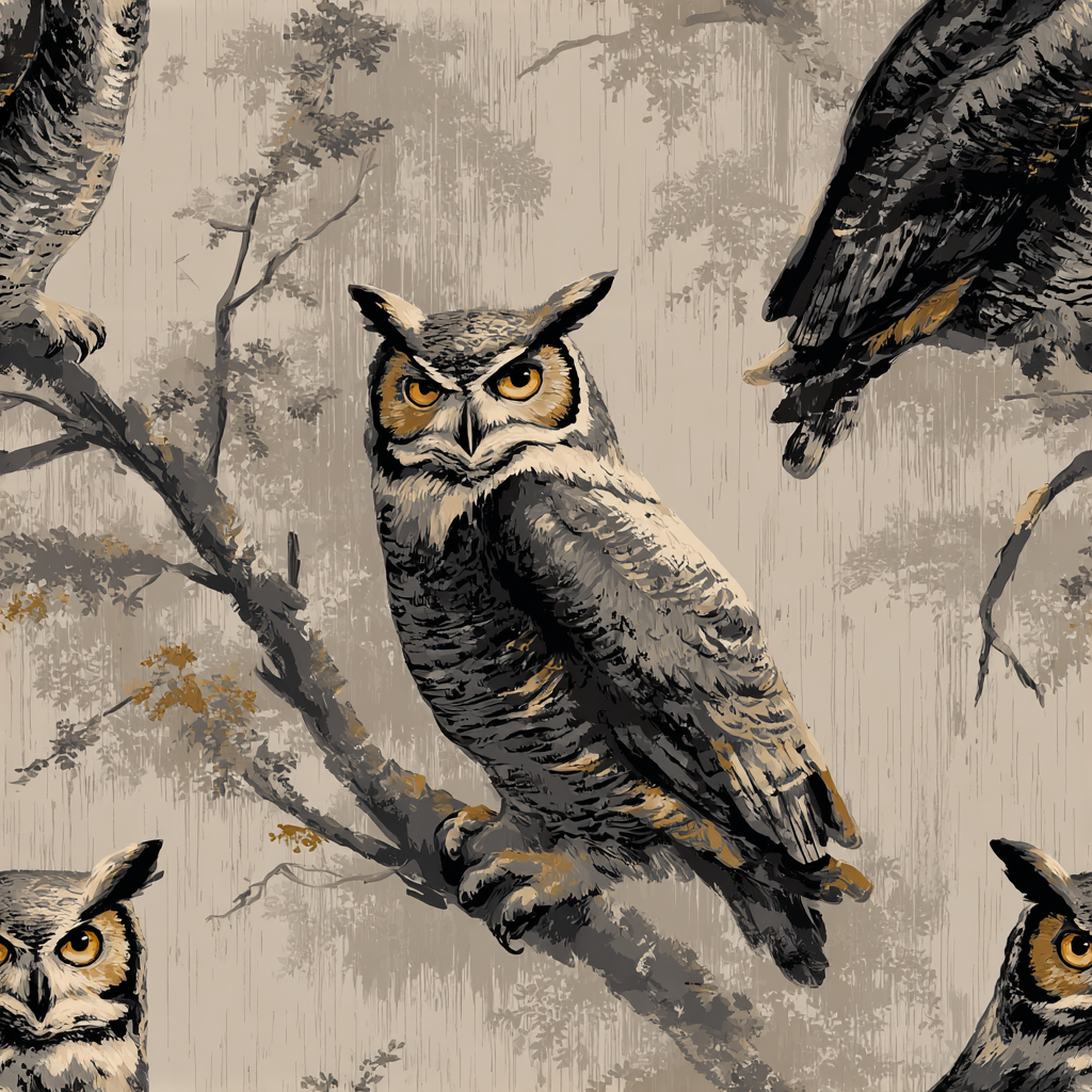 Commanding and quietly elegant, Ashwood Sentinel brings the forest’s nocturnal mystery indoors. Great horned owls perch on weathered branches, their gaze piercing through layers of warm gray, umber, and shadowed bark. The brushwork is deliberate and textural — a painter’s study of patience and power. Ideal for libraries, offices, or masculine bedrooms, it adds gravitas and old-world charm. When paired with walnut cabinetry, black fixtures, or ambient lighting, the result is a space that feels both intellectual and instinctive — a meeting of wisdom and wilderness.