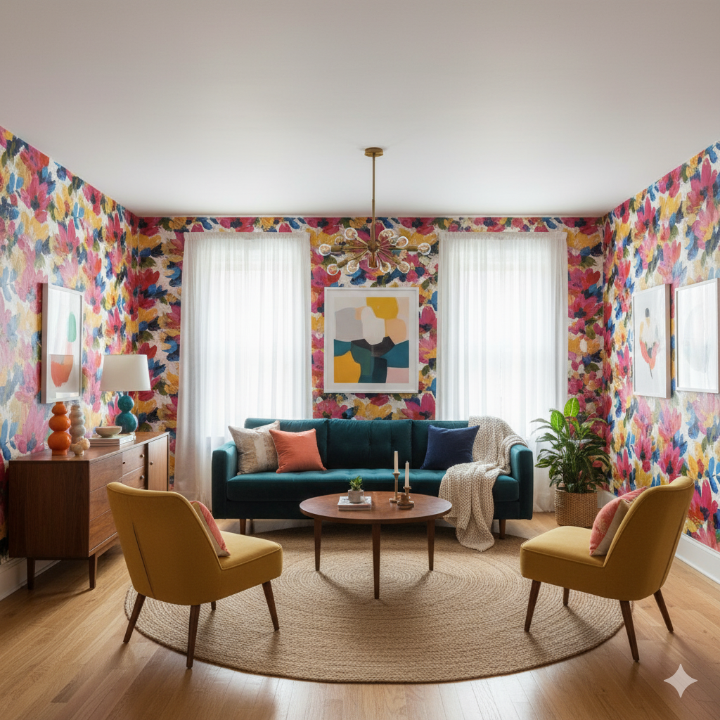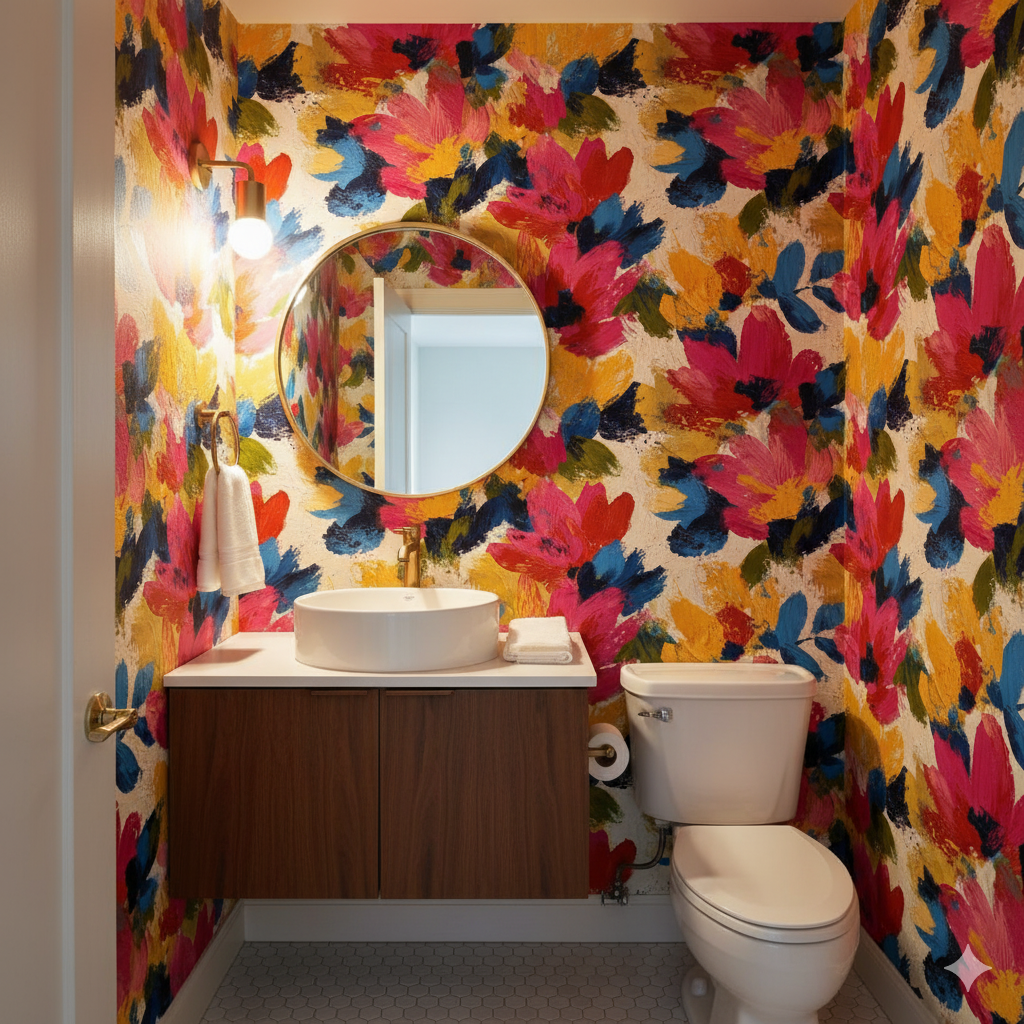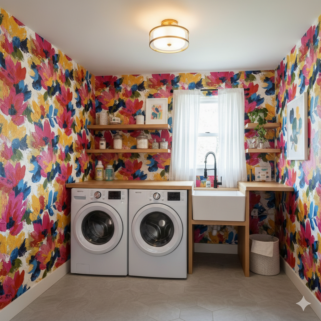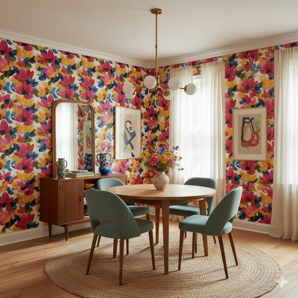 A lush celebration of paint, Atelier Bloom feels alive with thick, impasto brushwork in pink, ochre, navy, and moss. The florals are expressive and spontaneous — as if captured mid-creation in an artist’s studio. Every petal and stroke adds depth and vibrancy, making the walls appear textured and dynamic even in print. This design suits modern farmhouse kitchens, feminine offices, or art-inspired dining areas. When styled with linen curtains, oak tables, or matte black accents, it brings warmth and creative sophistication to the space.